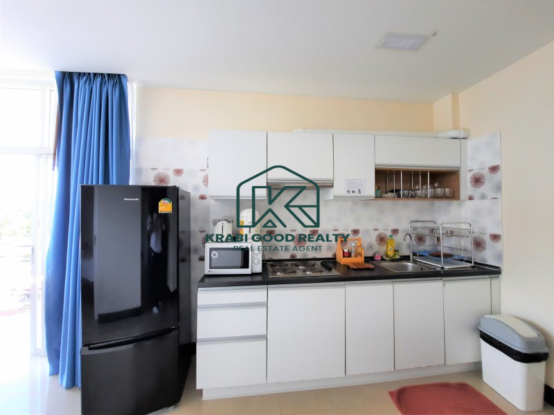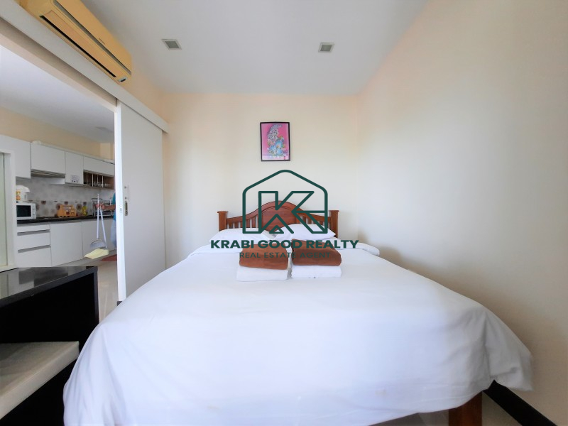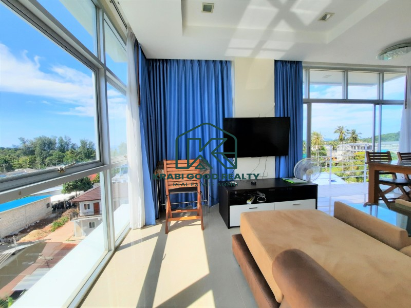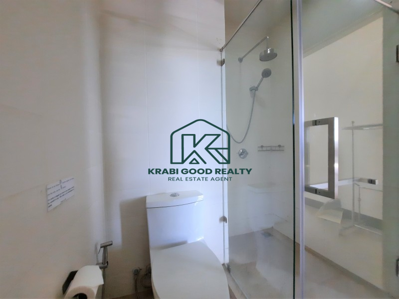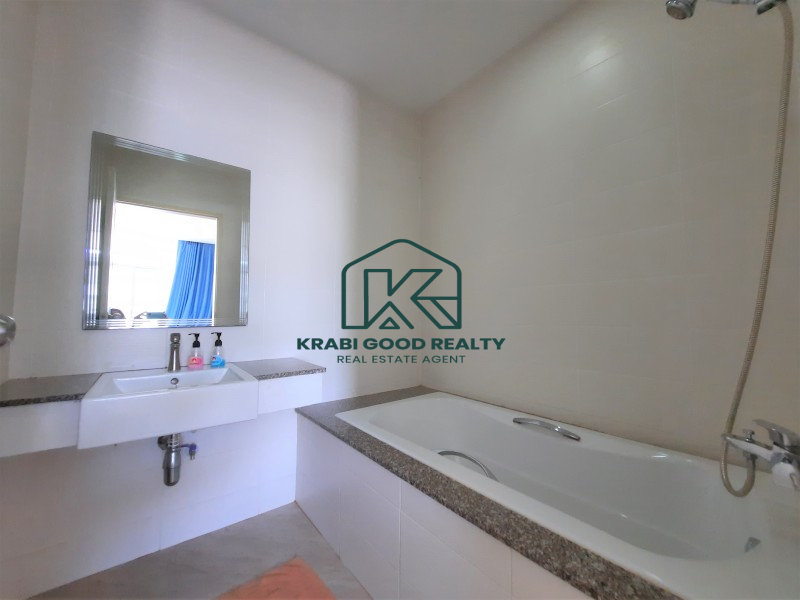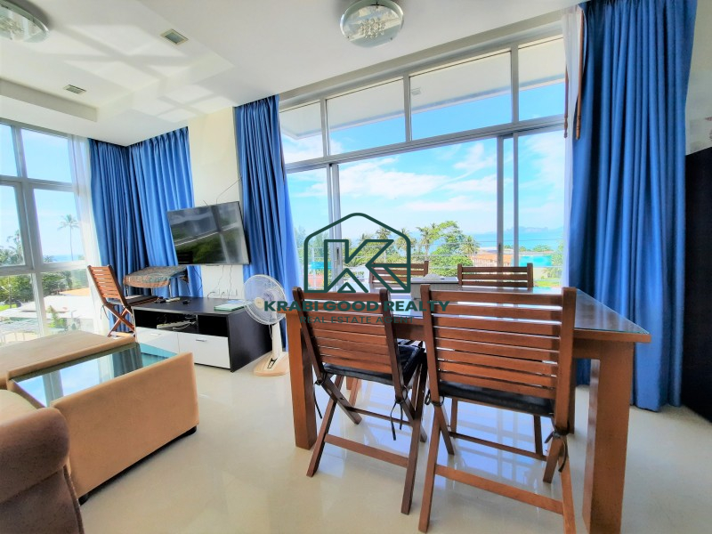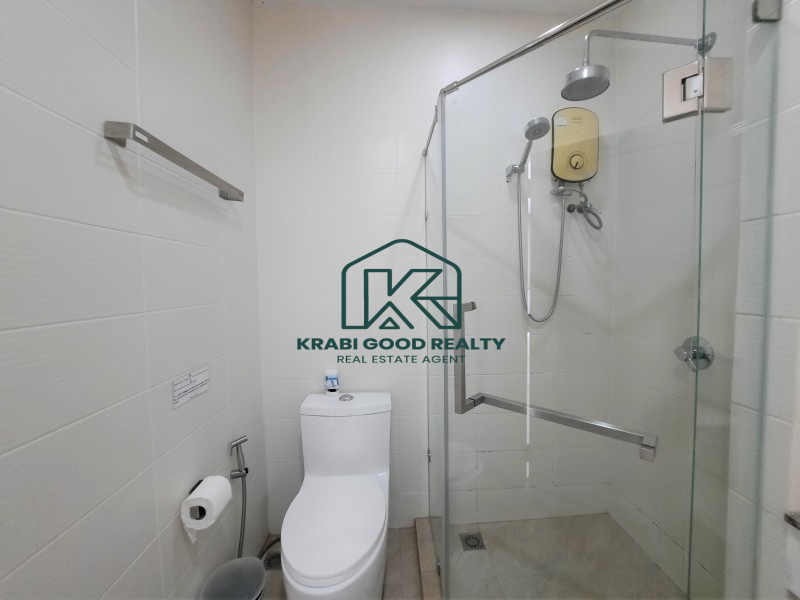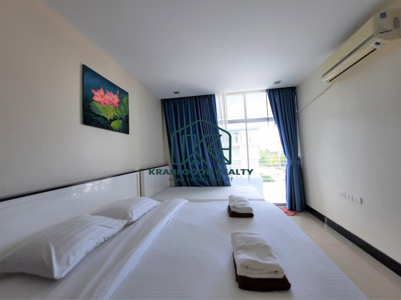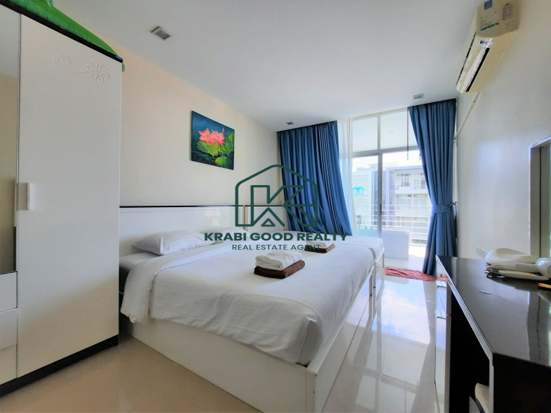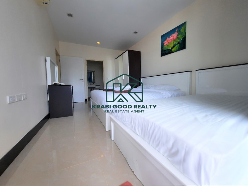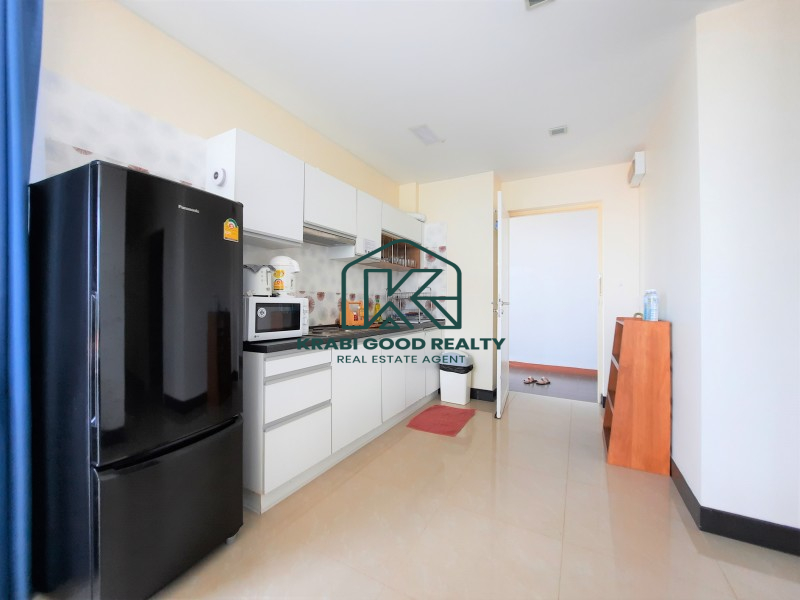 Condominium within walking distance to the beach and can find a restaurant right on the beach for dinner with a beautiful view of the sunset. The room is on the corner of the fourth floor. The building offers a panorama view of the sea and sunset from the living room and balcony. The plan consists of 2 bedrooms, 2 bathrooms, 2 balconies, a small kitchen and a living room. By dividing the proportion perfectly. The kitchen consists of hanging cabinets, sink, stove, and lockers. There is a dining table connected to the living room and a balcony overlooking the sea. The small bedroom is connected to the pool view balcony. There is a share bathroom that separated a dry section and shower room by a sliding glass. The master bedroom is an en suite bathroom that connect to the balcony while the pool view is combined with the small bedroom which emphasizes both functionality and beauty as well Convenient transportation near the sea, restaurants and places such as Ao Nang Beach 12 km, Makro Supermarket 15 km, Wattanapat Hospital 10 km, Krabi International School 14 km and Krabi Airport 32 km.