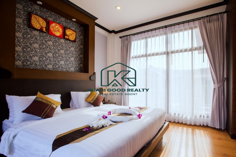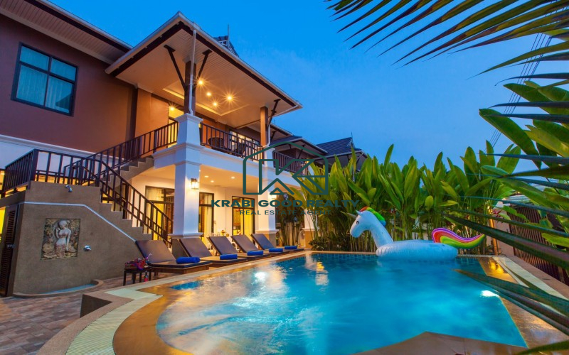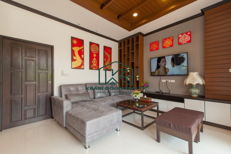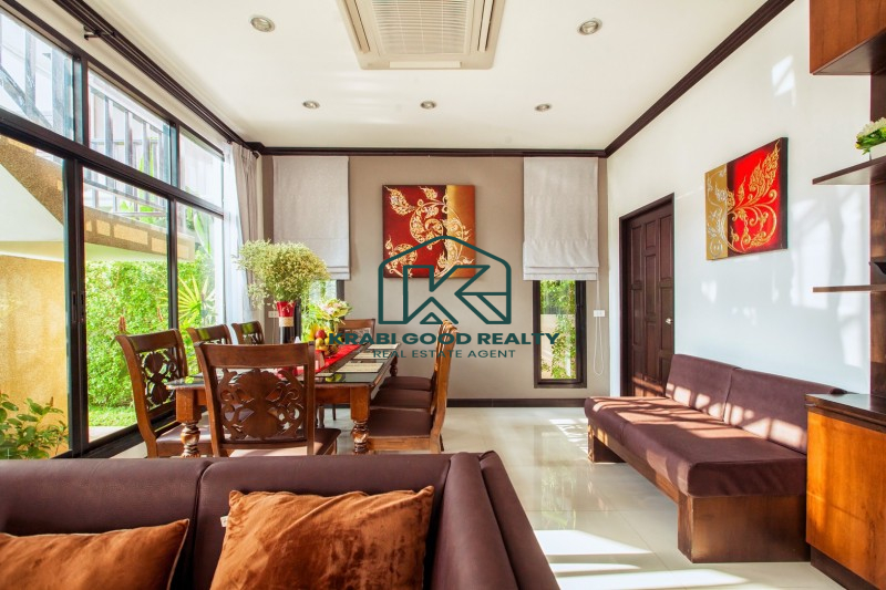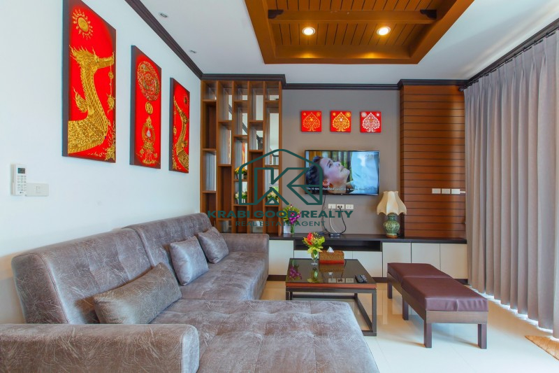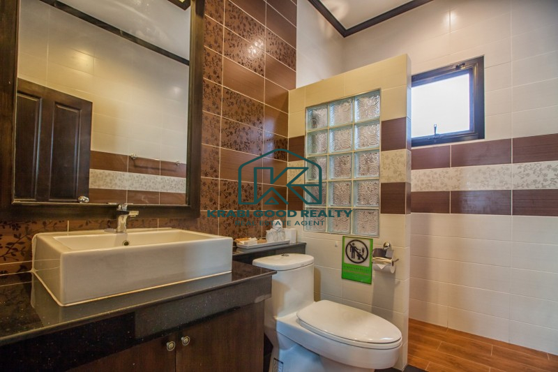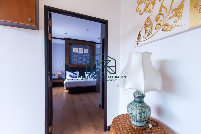 บ้าน 2 ชั้นพร้อมสระว่ายน้ำและสิ่งอำนวยความสะดวกครบครัน ตั้งอยู่ห่างจากหาดอ่าวนางแค่ 5 นาที ที่ดินขนาด 304 ตารางเมตร พื้นที่ใช้สอย 220 ตารางเมตร บ้านประกอบด้วย 4 ห้องนอนแบบมีห้องน้ำในตัว,ห้องนั่งเล่น,ห้องรับประทานอาหารและห้องครัว ภายในตกแต่งหรูหราและประโยชน์ใช้สอยที่ลงตัว ภายนอกมีที่จอดรถสำหรับ 2 คัน สะดวกสบาย ใกล้ร้านค้าและร้านอาหารต่างๆ เหมาะกับการพักผ่อนเป็นอย่างยิ่ง หาดอ่าวนาง 4 กม. แม็คโคร 3 กม. โรงพยาบาลวัฒนแพทย์ 3.5 กม. โรงเรียนนานาชาติกระบี่ 11 กม. สนามบินกระบี่ 27 กม.