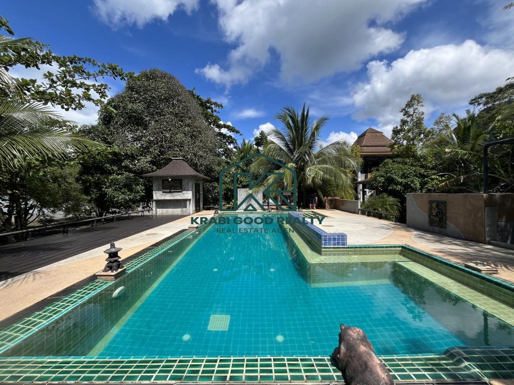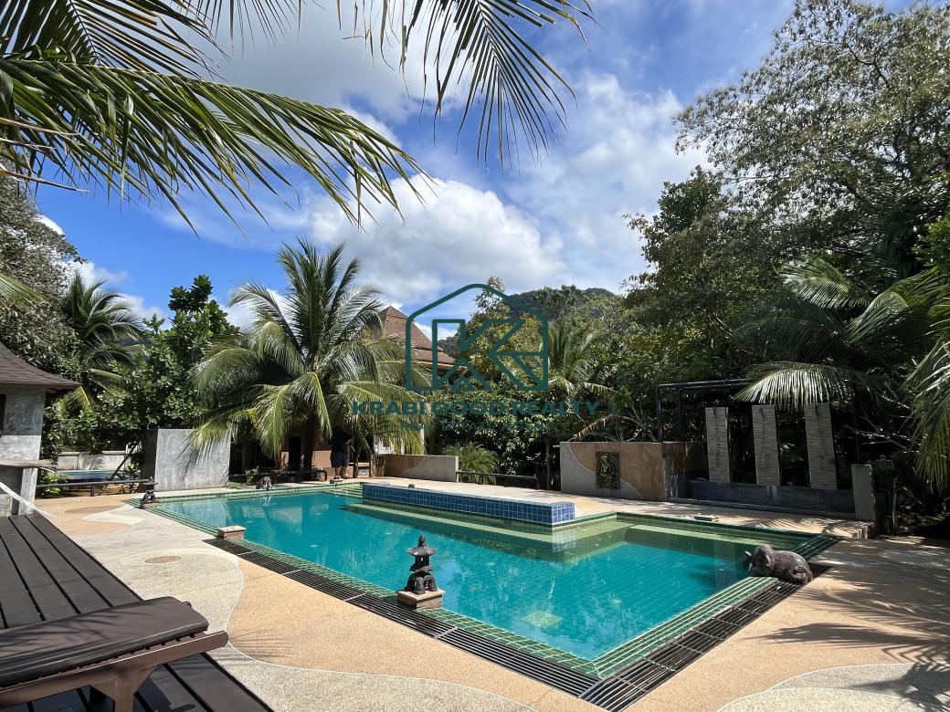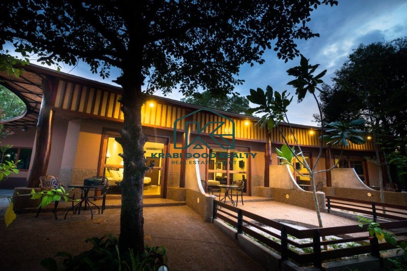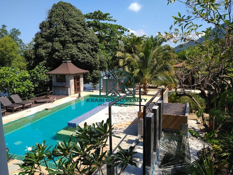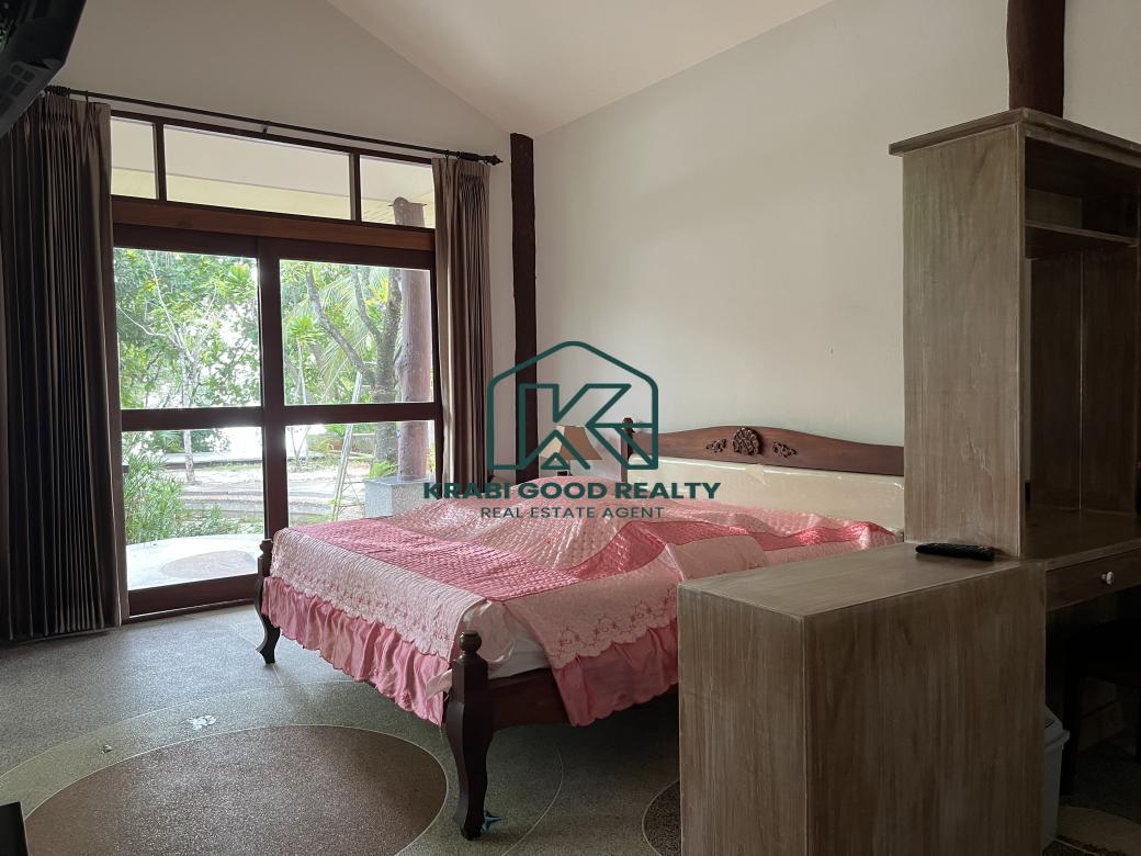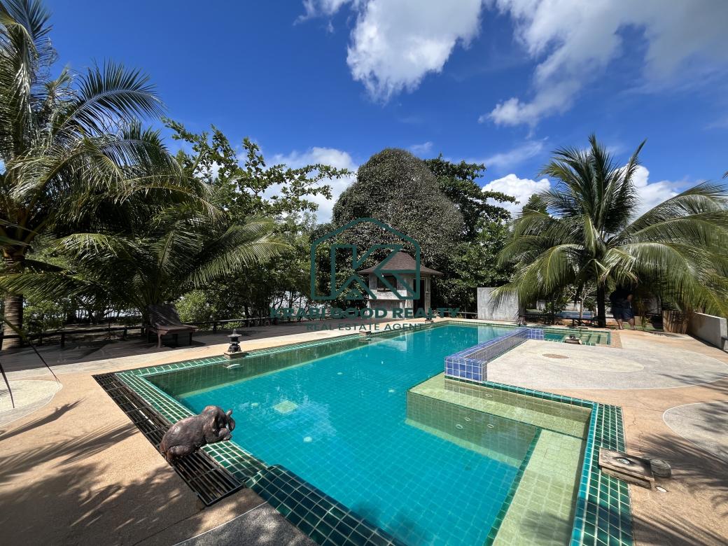 12 bedroom of the beautiful resort with islands view. The resort has a café and a restaurant. Surrounded by the natural, relaxing, and large swimming pool. It included a wooden bridge over the river for watching the beautiful sunset. Great location. The land size is almost 2 Rai, which is represented in the Chanote title deed. The plot length is approximately 80 meters. It consists of 9 units that are