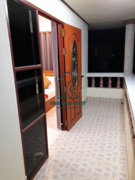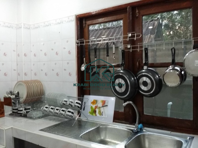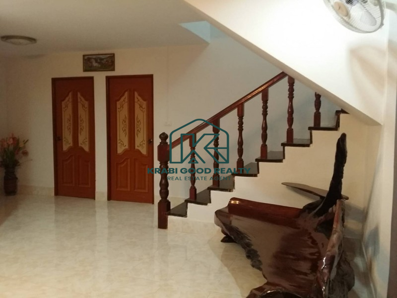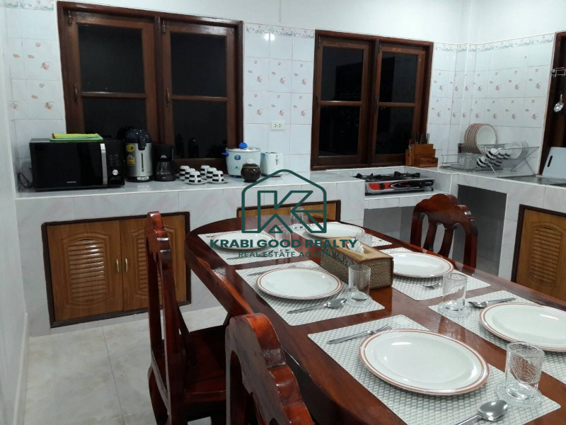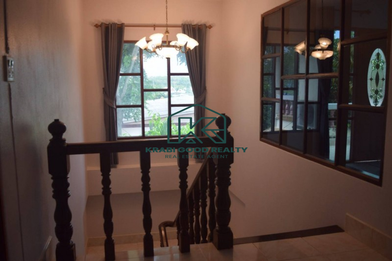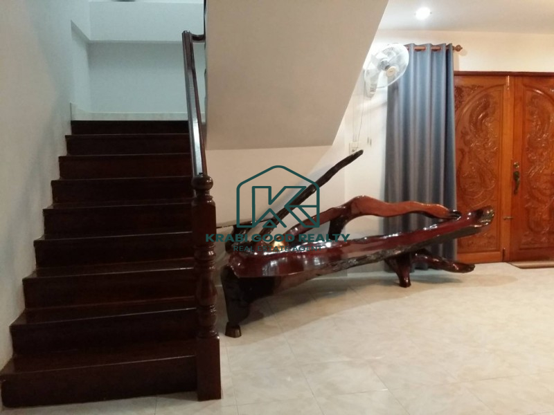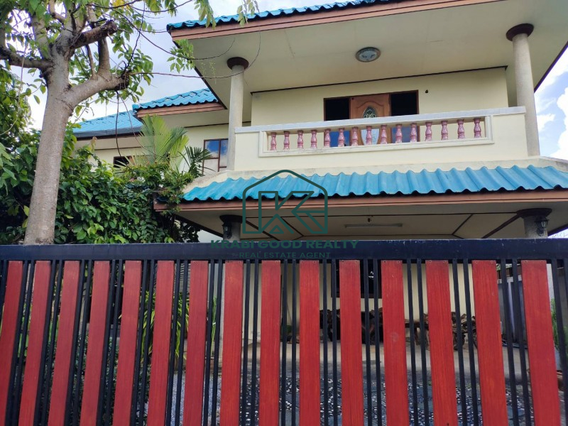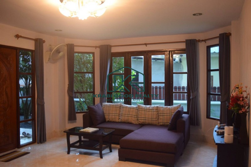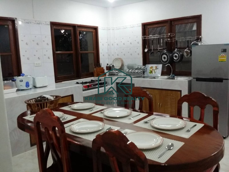 A family house with 5 bedrooms for rent in Aonang, Krabi. Quiet area and a good community. The living area is 180 sq.m. On the 1st floor, there is 1 living room, 1 dining room, 1 kitchen, 2 bedrooms, and 1 bathroom. On the 2nd floor are 3 bedrooms with 3 bathrooms. Fully furnished.