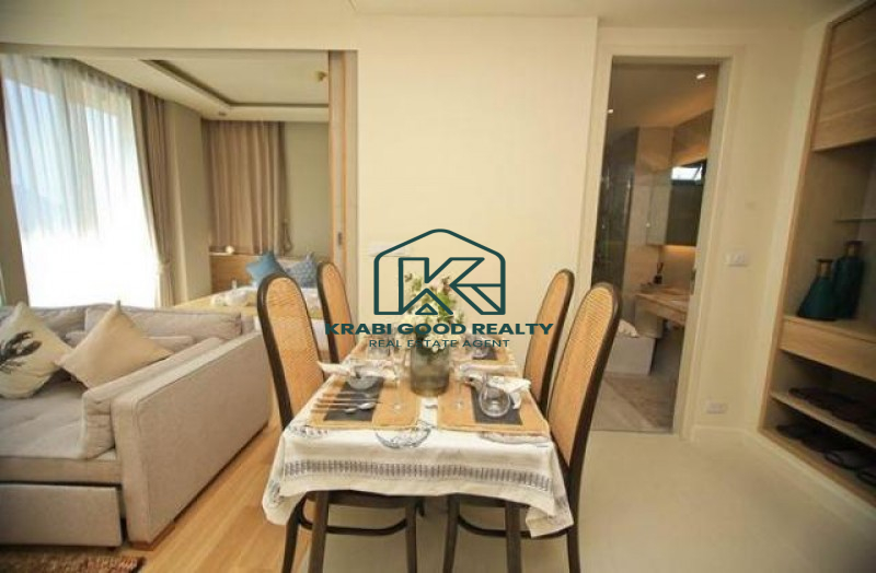 A condominium in the heart of Ao Nang. It is close to the beach, just a 1-minute walk from the boating point to Phi Phi Island, Nopparat Thara Beach Park, and Aonang Beach. The best location and the only one in Ao Nang. A condominium with a mountain setting. In private comfort, 1 bedroom with luxury furniture on an area of 35.20 sqm. 1 living area, kitchen and dining zone in the middle of room. 1 TV in living room. Swimming pool with star lights under the pool. and a fitness center with complete exercise equipment. With a key card system, CCTV, and 24-hour security guards, you can rest easy.