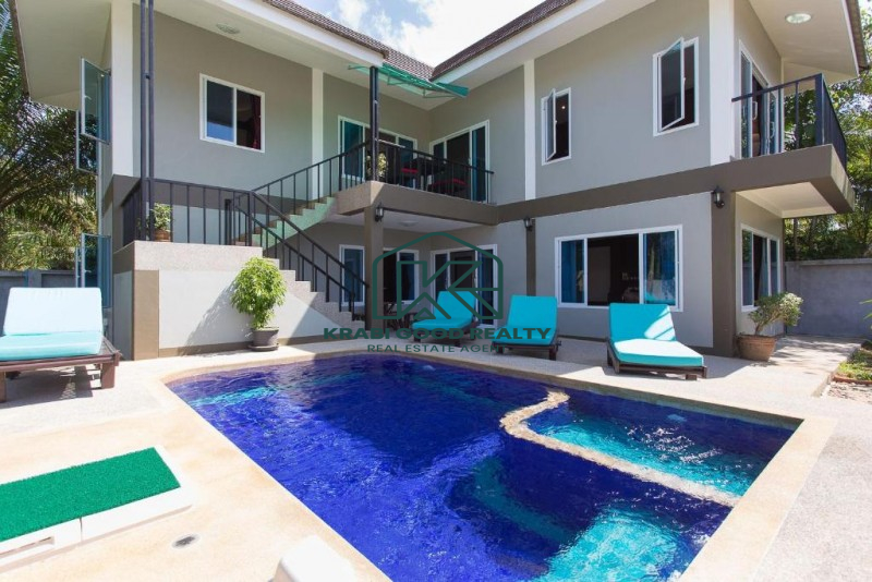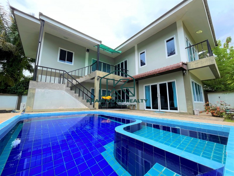 This two-story pool villa on 764.4 square meters of land has a spacious garden. Thai and contemporary style. Inside decoration with wood furniture. On the ground floor, there is a large sofa in the living area and one bedroom. The upper floors have a further two bedrooms and a living area with a balcony to enjoy the mountain view in the back. Every bedroom features a walk-in wardrobe and an ensuite bathroom. The separate kitchen beside the villa is suitable for a big family dining outside, including Sala. The villa is perfect for a family who wants a villa in a good location and for rental investment. (For rental accommodation, a maximum of 9 people)