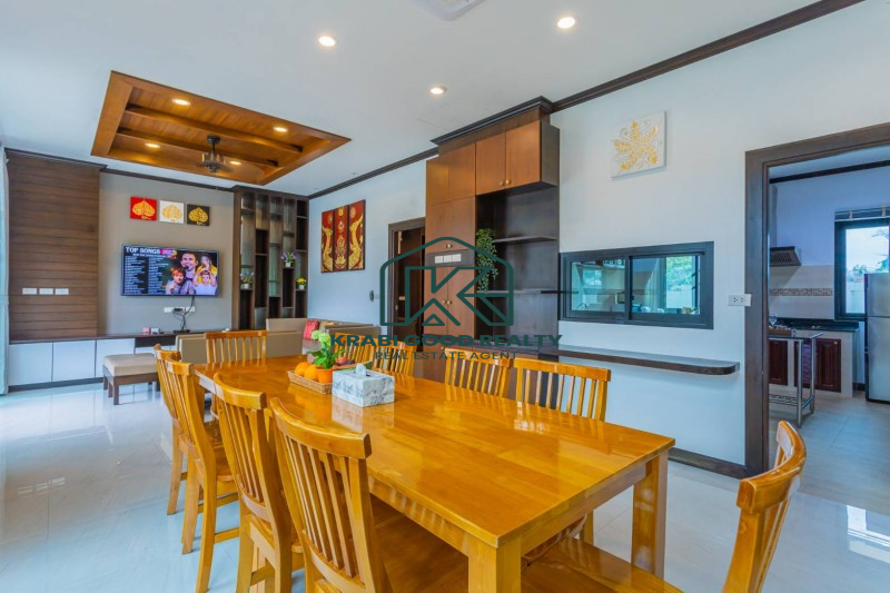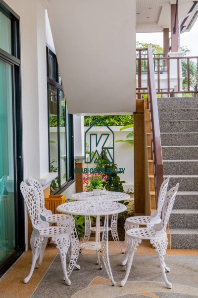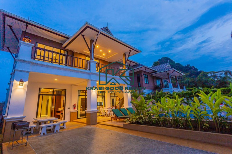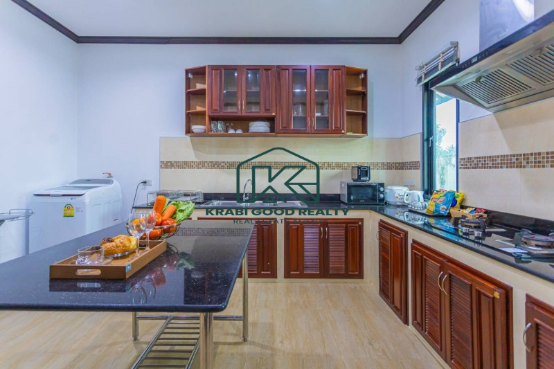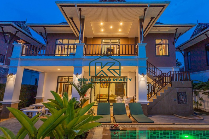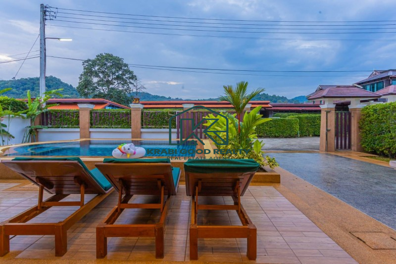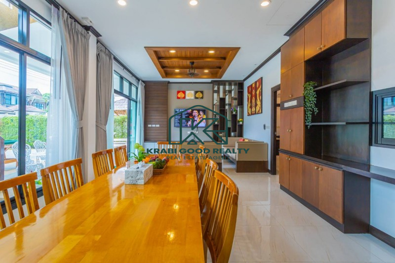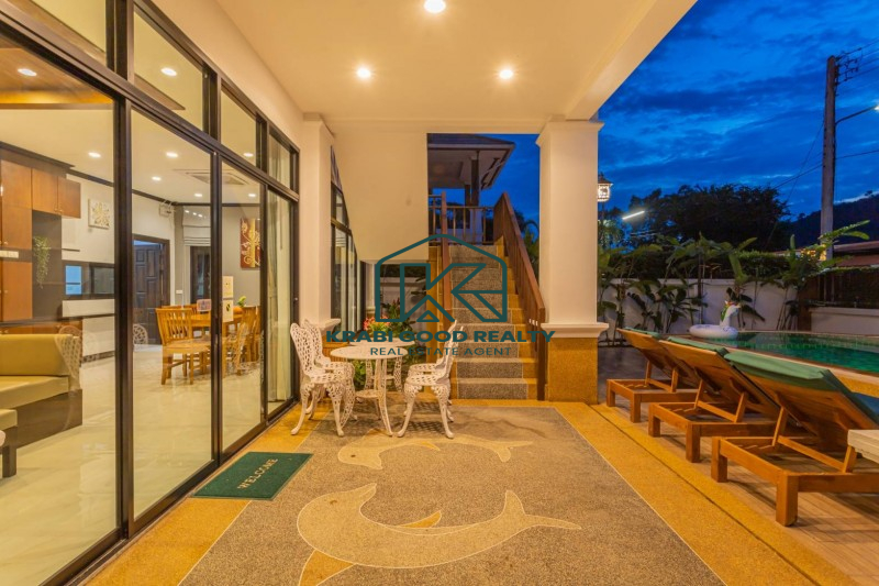 Two-storey house with swimming pool and full facilities. Located just 5 minutes from Ao Nang Beach. Land size 304 sq m, usable area 220 sq m. The house consists of 4 bedrooms with en-suite bathroom, living room, dining room and kitchen. The interior is luxuriously decorated and functional. Outside there is a parking lot for 2 cars, conveniently to go near shops and restaurants.