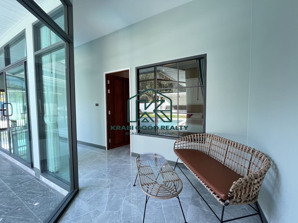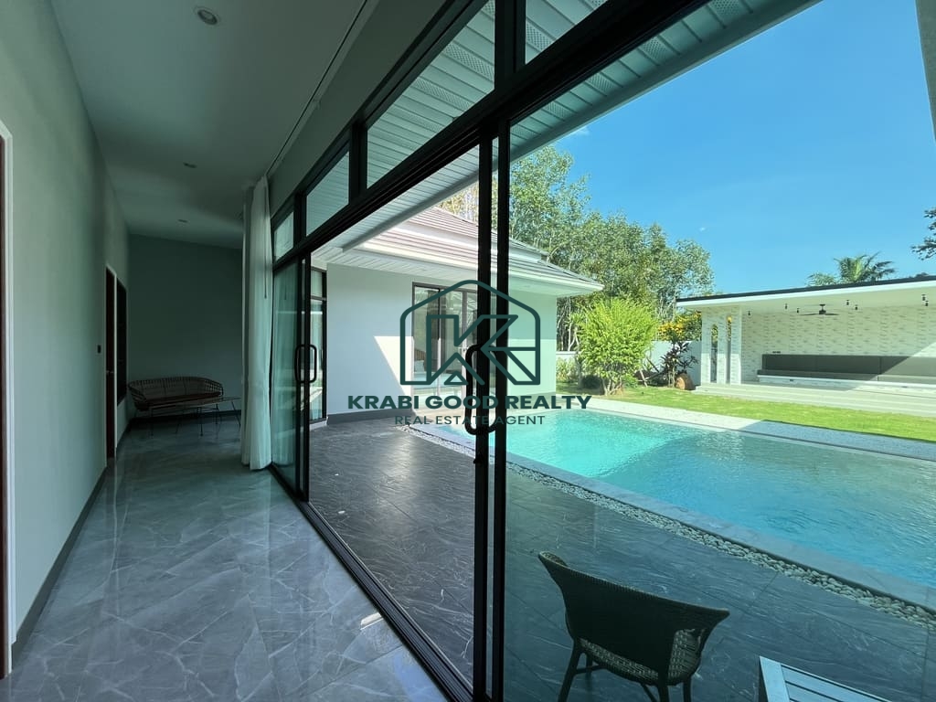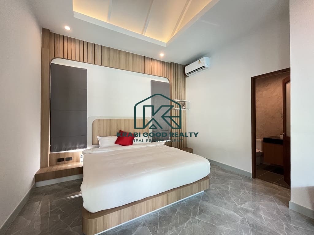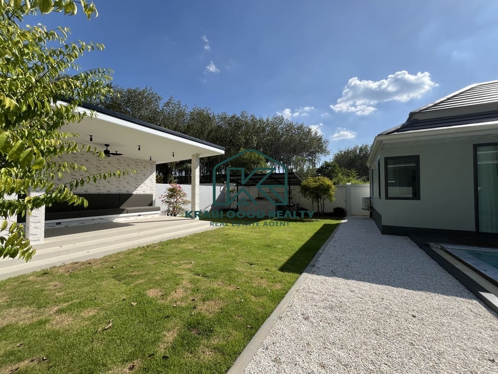 This is a peaceful first villa in a new project at Aonang, just a short distance from the beach ,Krabi town ,and the airport. The land size 640 sqm Chanote title deed, house living area of 180 sqm. The private road wide 8 meters.. Ao Nang is a beach on the Andaman Sea coast and one of Thailand's most popular tourist destinations This luxury pool villa of these modern and functional villa consists of 3 bedroom comprising of 1 master bedroom have walk in closet, aircon, and bathtub. All standard bedrooms have ensuite bathrooms and wardrobes, as well as aircon. The combined living, dining, and kitchen area, Which is fully furnished, means that the villa is large enoug to accommodate a full family of three or more. As well as offering spacious living interiors, this villa have private saltwater system swimming pool, spacious gardens suitable for outdoor part, dinners and barbecues. .Carport for 2 cars. Special feature high construction quality ceiling height 3.5 meters, underground cable system, government water and electric. Where you can relax and enjoy the great Aonang weather in the comfort of your own villa.