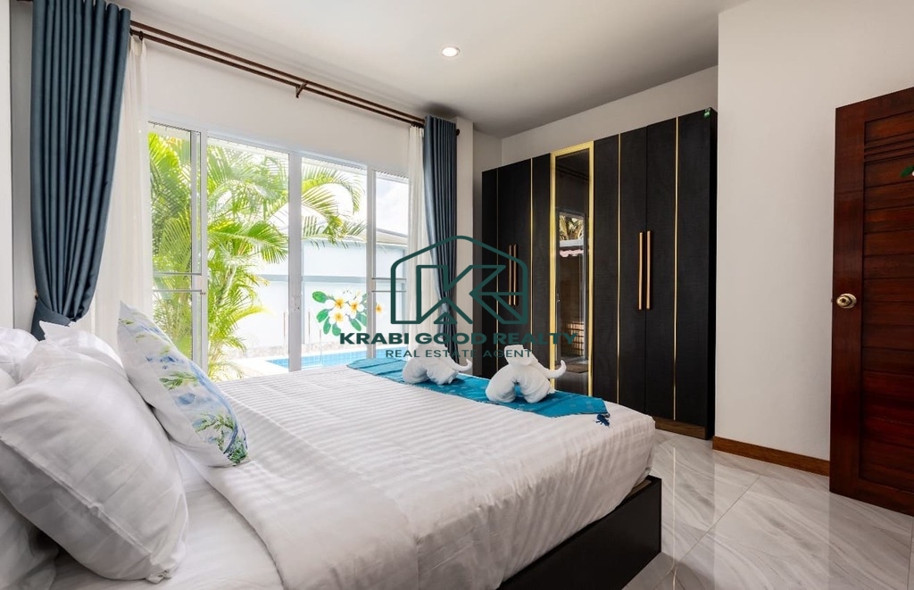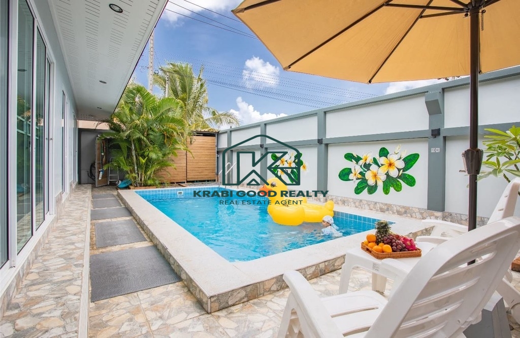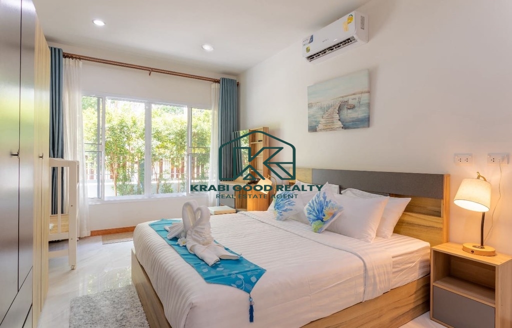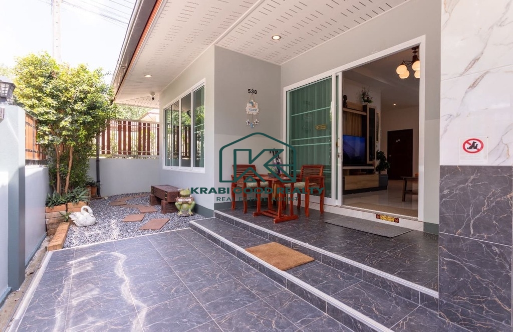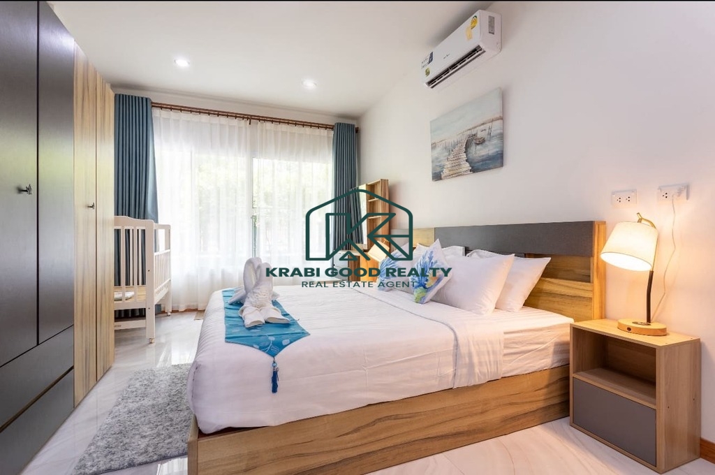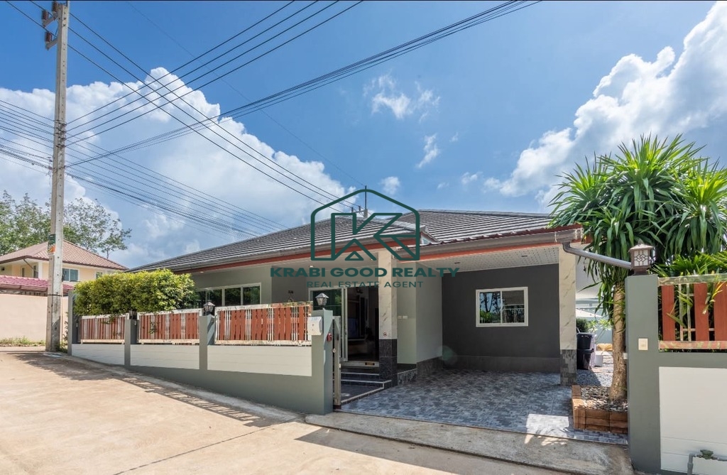 บ้าน 3 ห้องนอนพร้อมสระว่ายน้ำให้เช่าในทำเลทอง อ่าวนาง กระบี่ บ้านมีพื้นที่ใช้สอยทั้งหมด 133 ตร.ม. ห้องนั่งเล่นขนาดใหญ่พร้อมเตียงโซฟาและสมาร์ททีวี ห้องนอนแต่ละห้องมีเตียงควีนไซส์ โต๊ะเครื่องแป้ง ตู้เสื้อผ้า และเครื่องปรับอากาศ ครัวฝรั่งครบชุด. สามห้องนอน 3-บาท. โต๊ะทานอาหารพร้อมเก้าอี้ 6 ตัว. มีโต๊ะทำงานและเครื่องซักผ้า สระว่ายน้ำระบบคลอรีนส่วนตัว. สวนขนาดเล็กด้านข้างและหลังบ้าน ที่จอดรถหนึ่งคันมีหลังคา. เหมาะสำหรับผู้ที่ต้องการเช่าระยะยาว