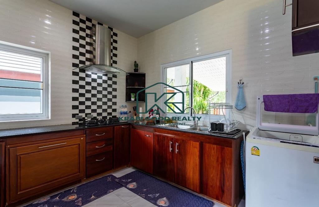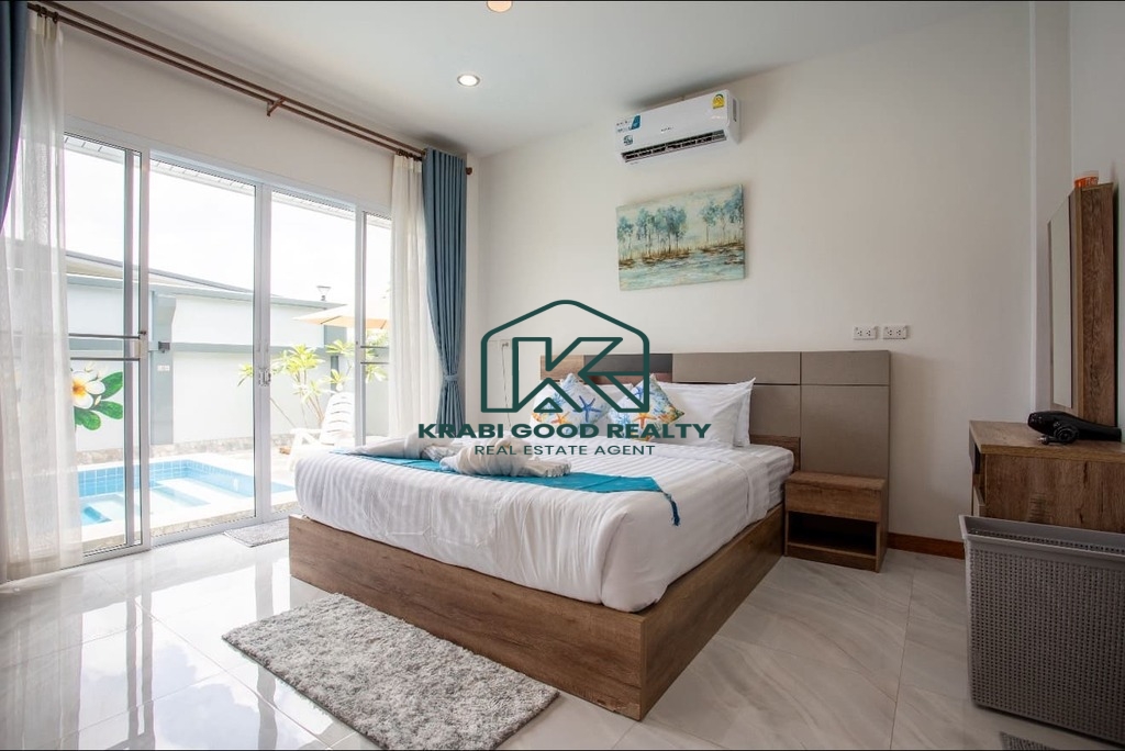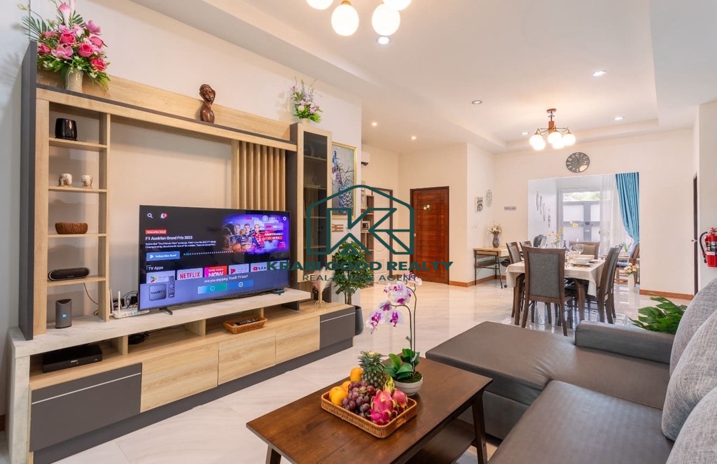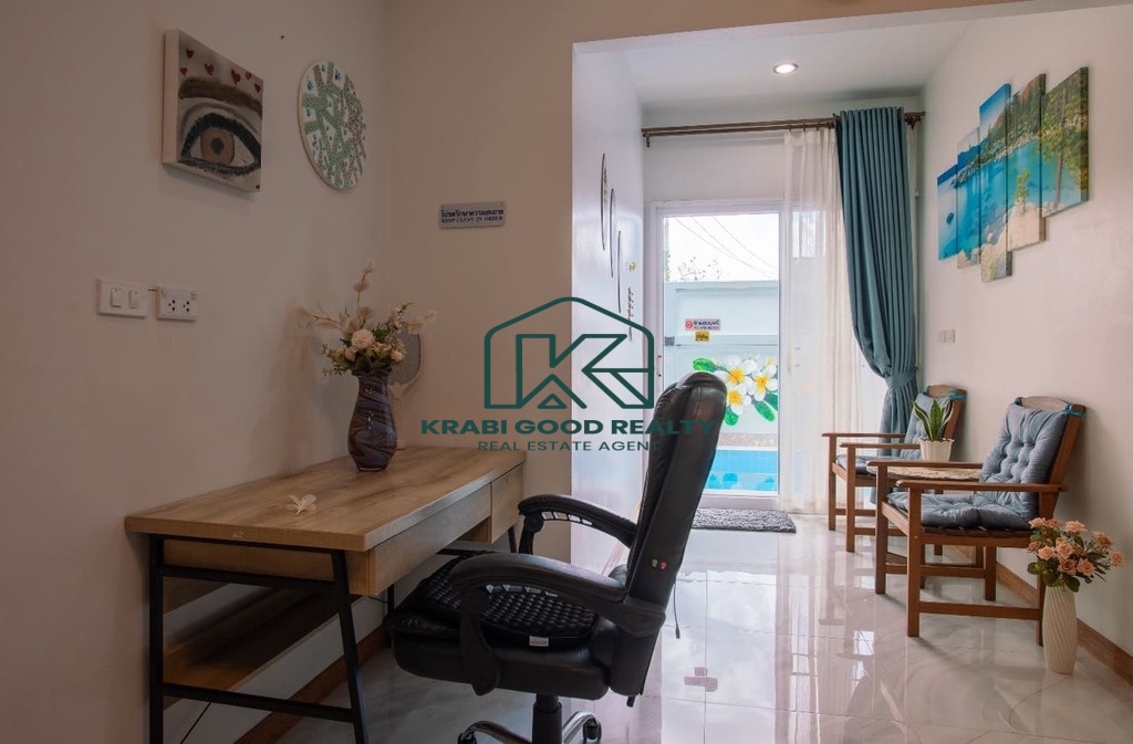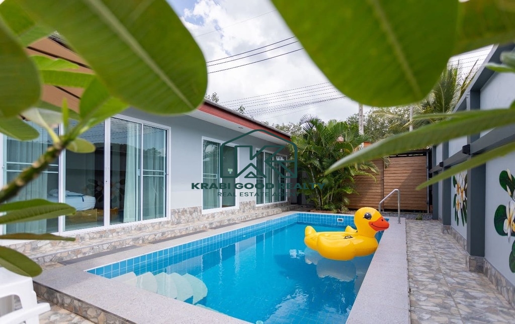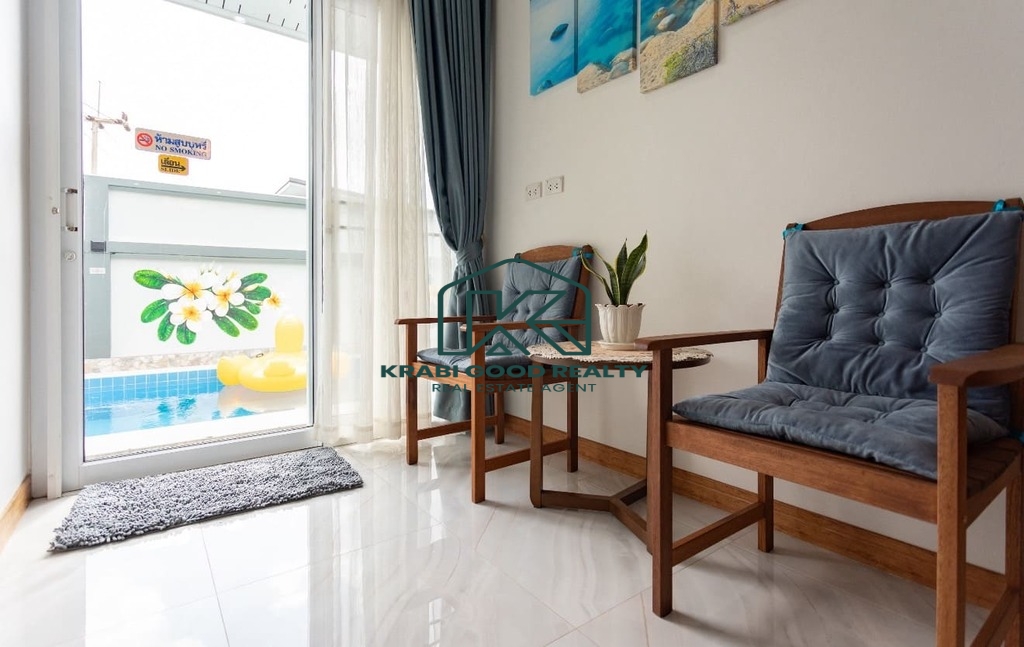 บ้าน 3 ห้องนอนพร้อมสระว่ายน้ำให้เช่าในทำเลทอง อ่าวนาง กระบี่ บ้านมีพื้นที่ใช้สอยทั้งหมด 133 ตร.ม. ห้องนั่งเล่นขนาดใหญ่พร้อมเตียงโซฟาและสมาร์ททีวี ห้องนอนแต่ละห้องมีเตียงควีนไซส์ โต๊ะเครื่องแป้ง ตู้เสื้อผ้า และเครื่องปรับอากาศ ครัวฝรั่งครบชุด. สามห้องนอน 3-บาท. โต๊ะทานอาหารพร้อมเก้าอี้ 6 ตัว. มีโต๊ะทำงานและเครื่องซักผ้า สระว่ายน้ำระบบคลอรีนส่วนตัว. สวนขนาดเล็กด้านข้างและหลังบ้าน ที่จอดรถหนึ่งคันมีหลังคา. เหมาะสำหรับผู้ที่ต้องการเช่าระยะยาว
