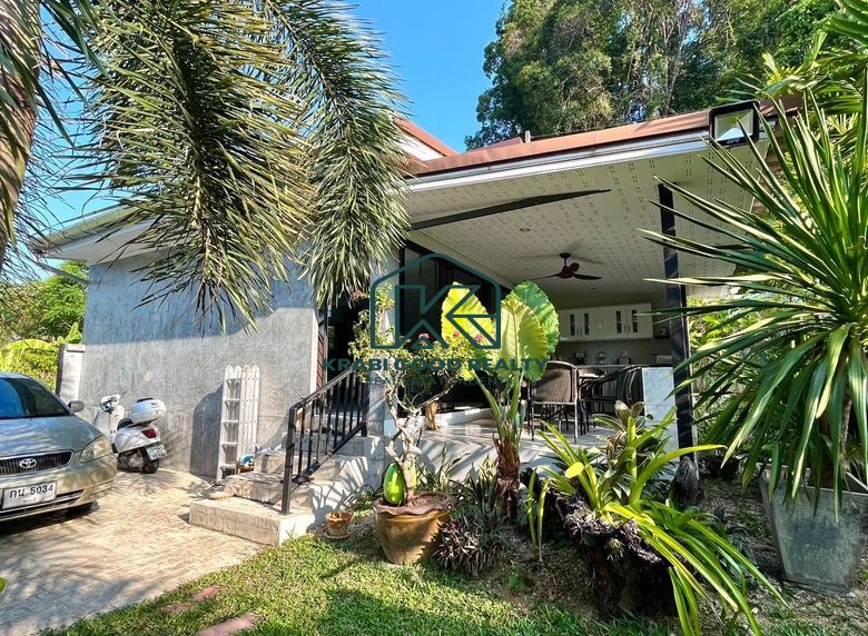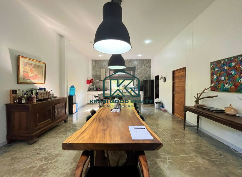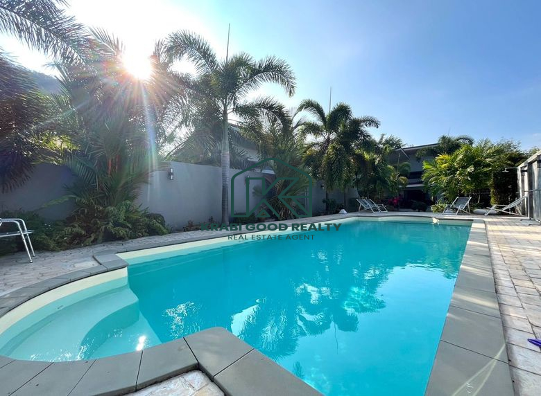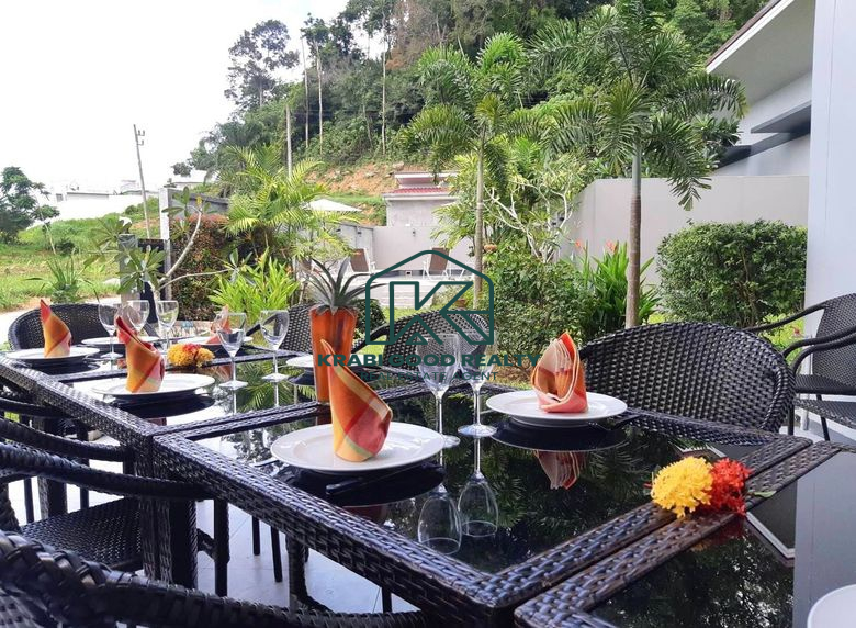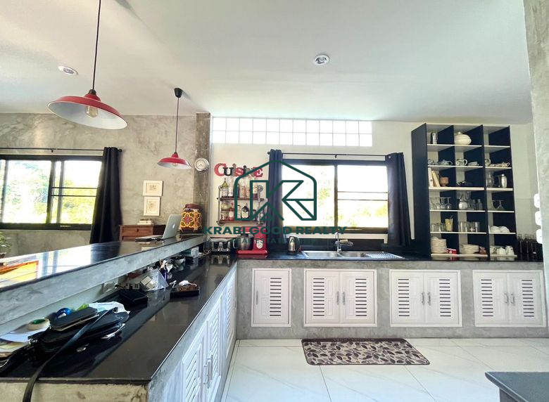 Prominent modern-style villa and bungalow business for sale surrounded by mountain views in Ao Nang, Krabi, and close to the famous beach Ao Nang Beach, land size 4,086.40 square meters, divided into 3 parts; the first part is a 5-bedroom villa. The second part is a bungalow, and the third part is the common kitchen and living area. Don't miss out on the opportunity to own an amazing property in a beautiful area with amazing weather. And it is desirable for investors; you can own and continue the business.