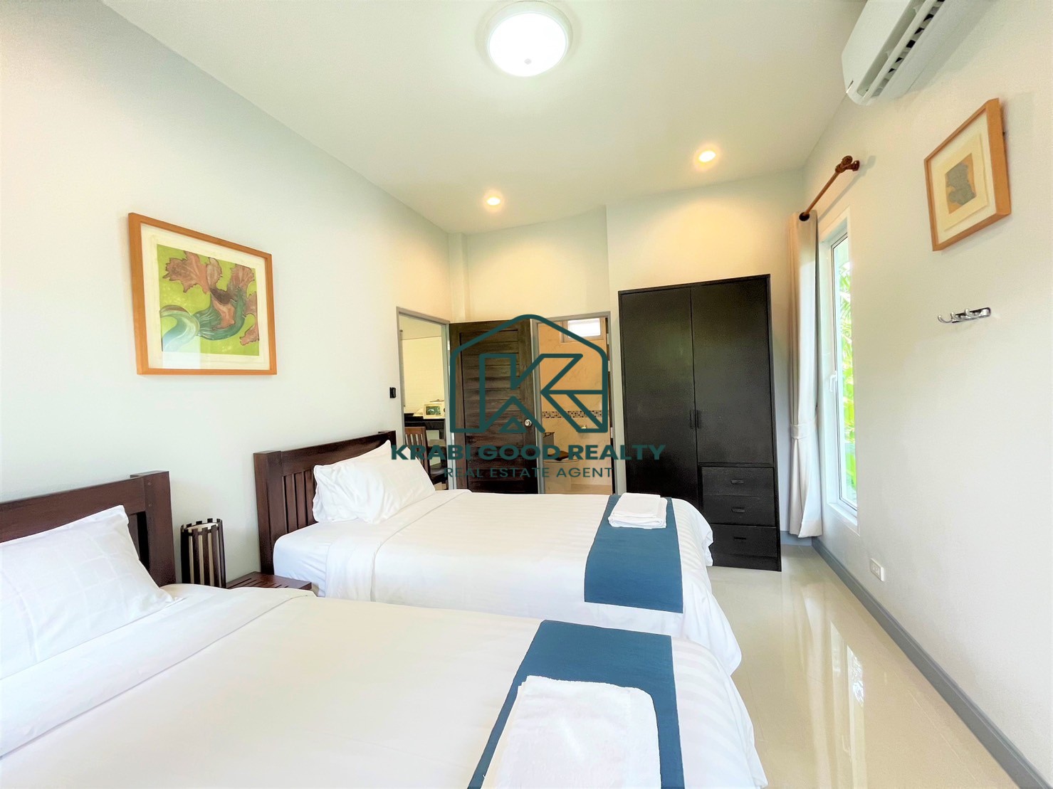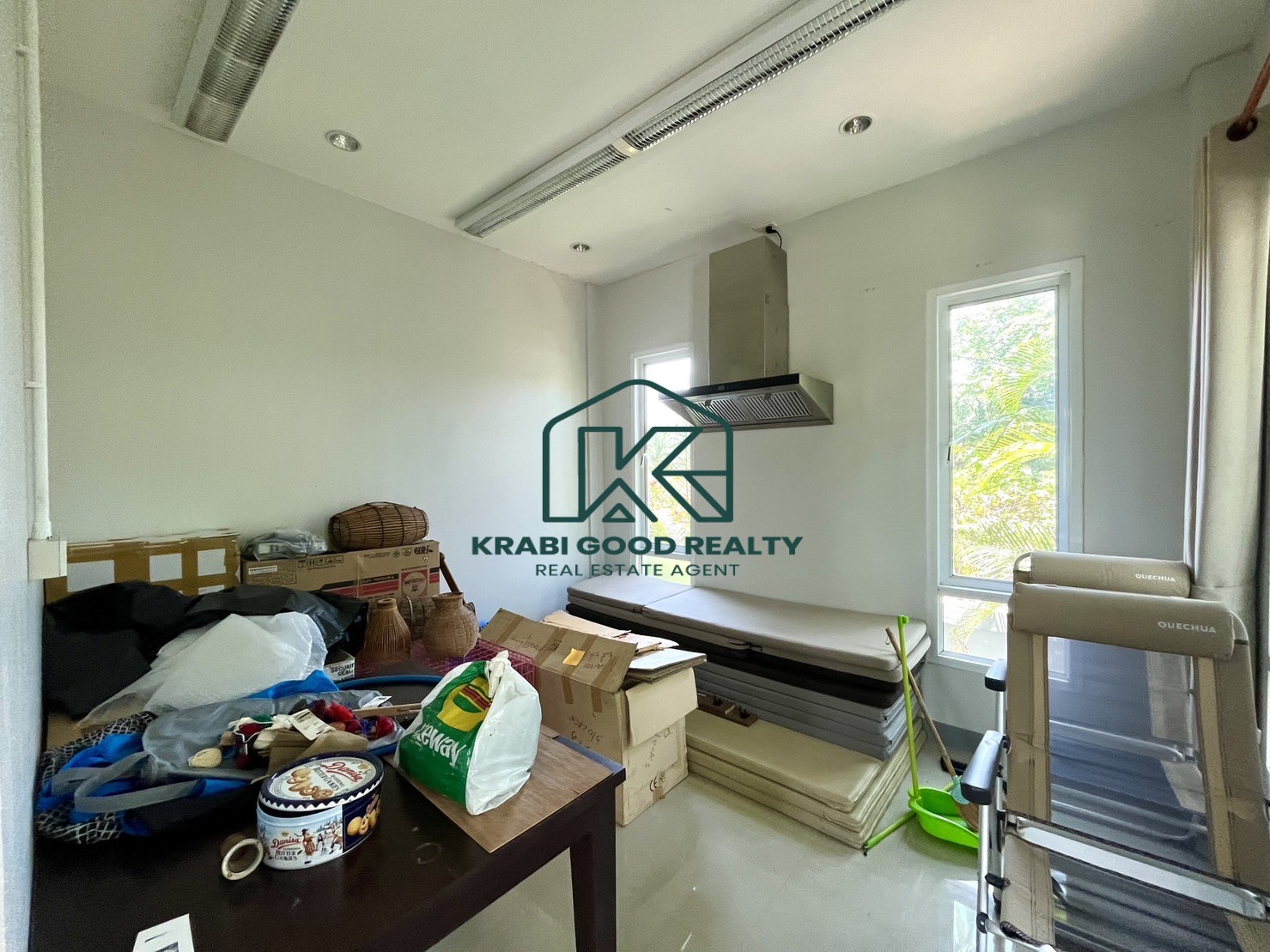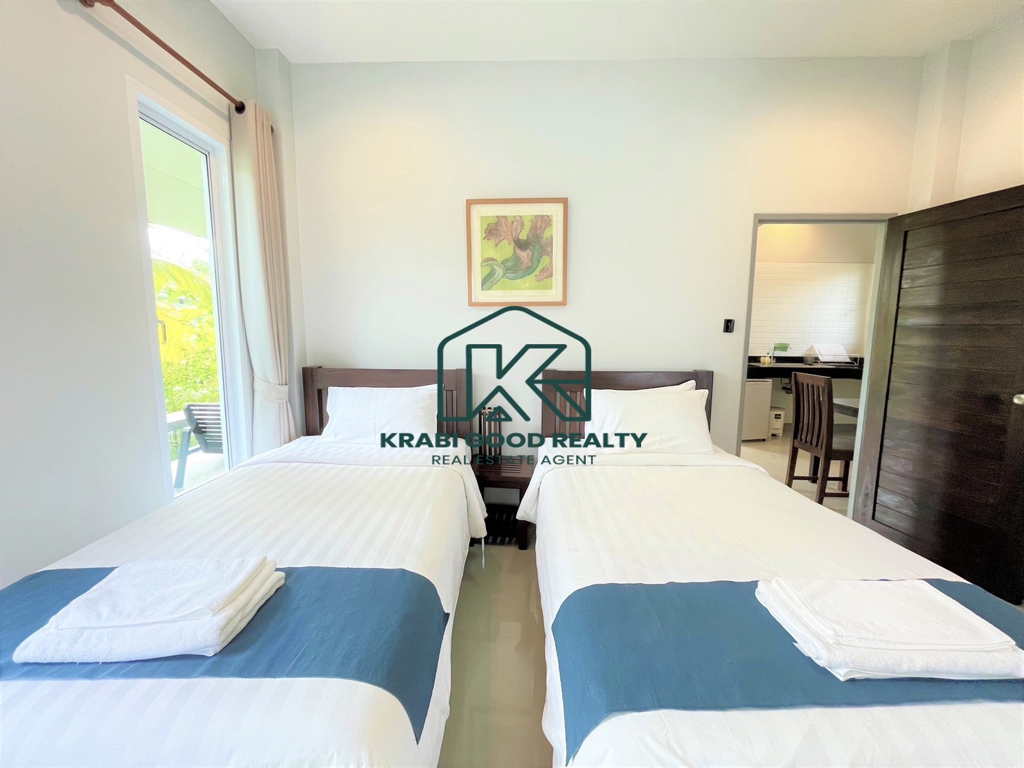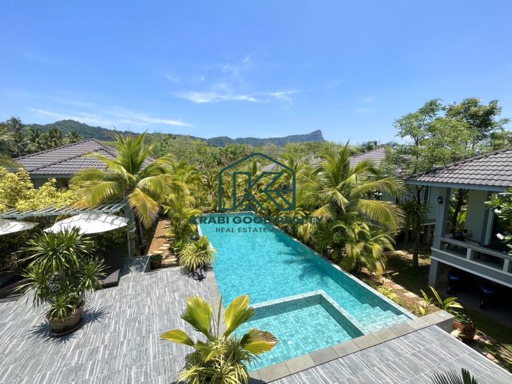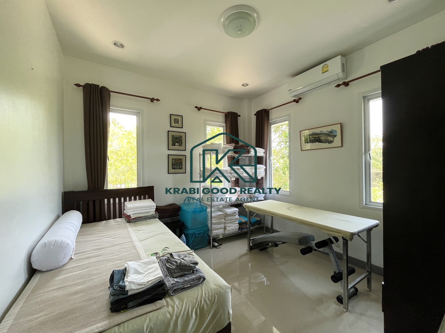 The accommodations are villas and bungalows. Business for sale located in the Aonang area and close to Klong Muang Beach in only 5 minutes. Three-bedroom villa and 5-Bungalow connecting with a communal salt swimming pool for both children and adults size of 5.2*15.6 meters. There is a sunbathing area that feels like being by the sea. Overlooking the view of coconut trees and surrounded by many trees that make the atmosphere shady. Suitable for investors who want to own a beautiful and private property. This property features two-story three bedroom villas, five bungalows, and a one-story raised studio.
