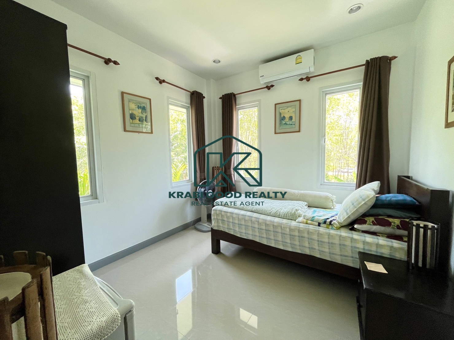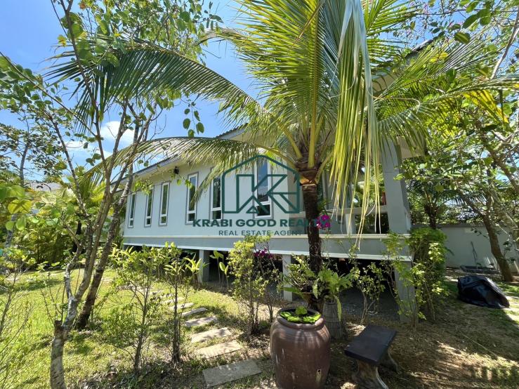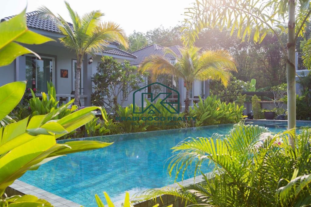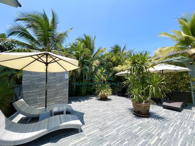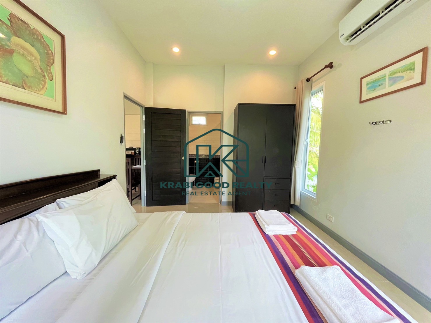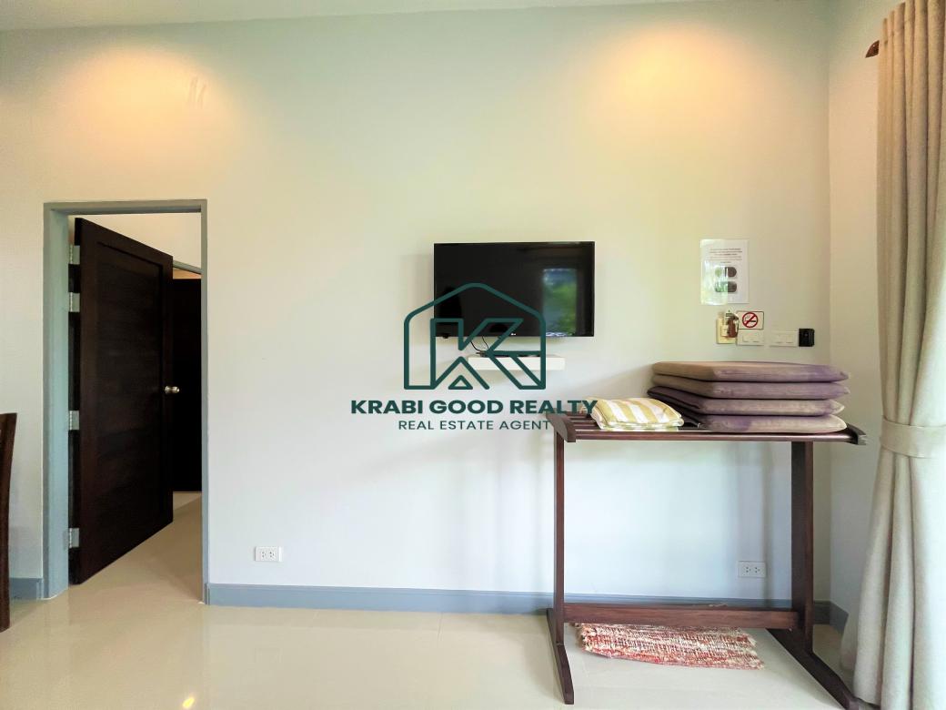 The accommodations are villas and bungalows. Business for sale located in the Aonang area and close to Klong Muang Beach in only 5 minutes. Three-bedroom villa and 5-Bungalow connecting with a communal salt swimming pool for both children and adults size of 5.2*15.6 meters. There is a sunbathing area that feels like being by the sea. Overlooking the view of coconut trees and surrounded by many trees that make the atmosphere shady. Suitable for investors who want to own a beautiful and private property. This property features two-story three bedroom villas, five bungalows, and a one-story raised studio.
