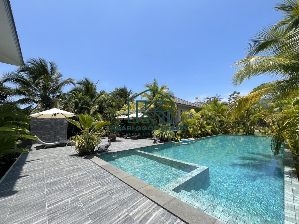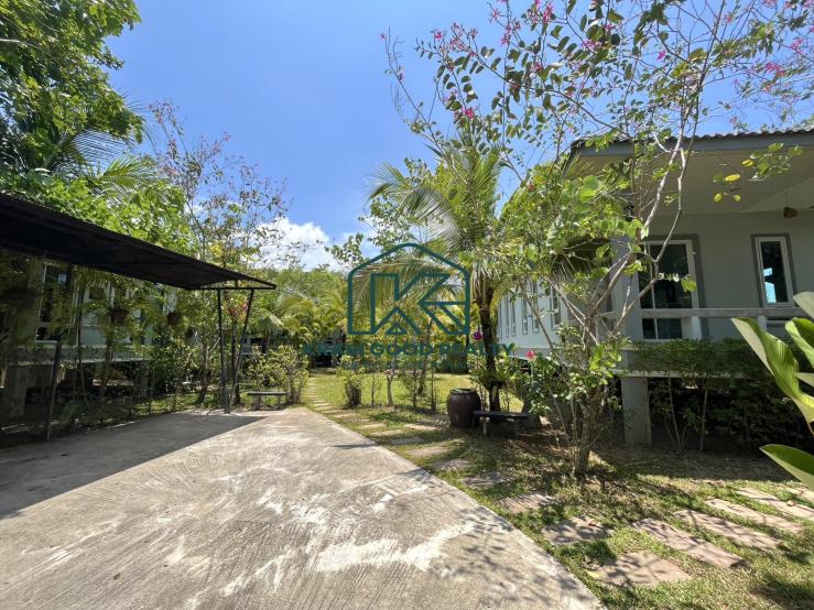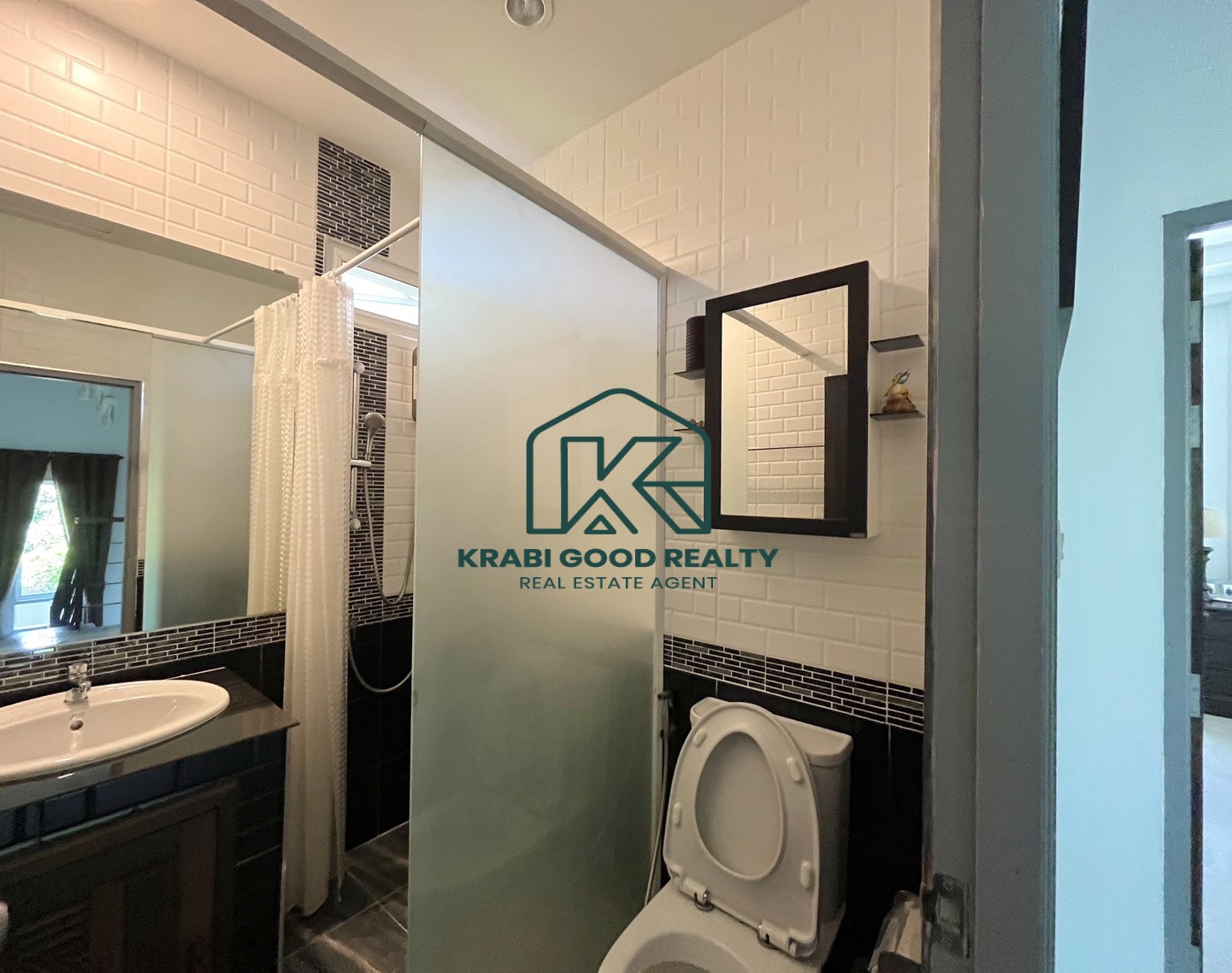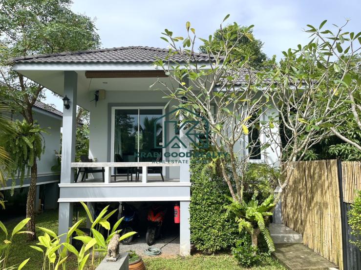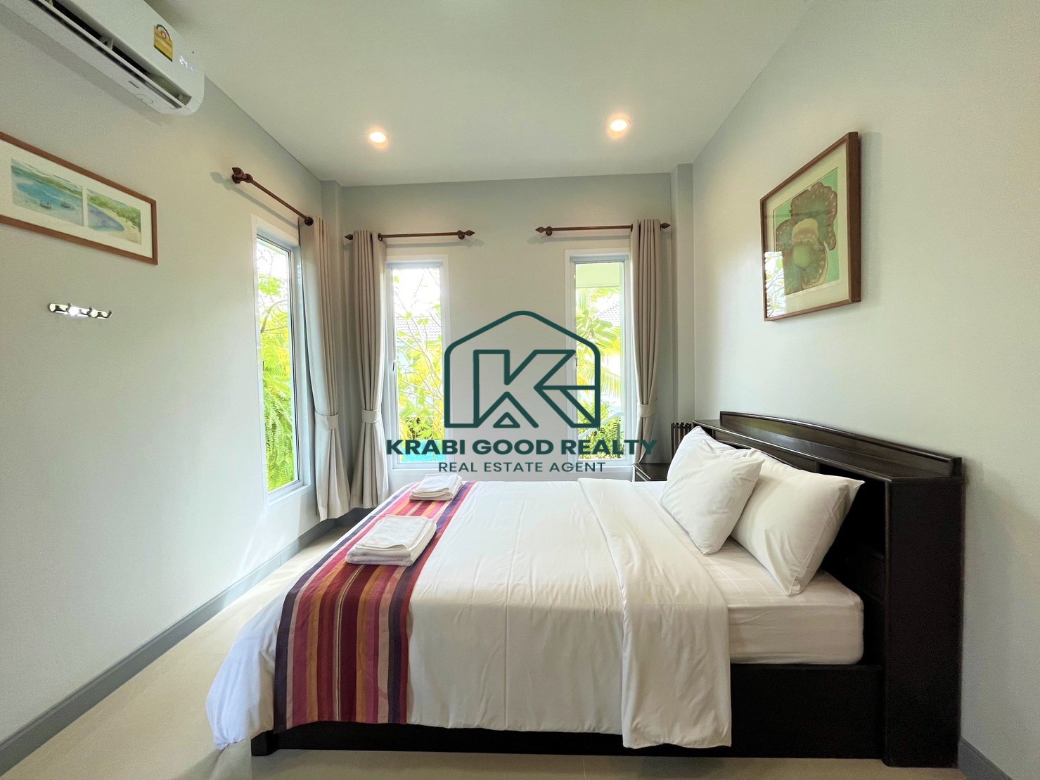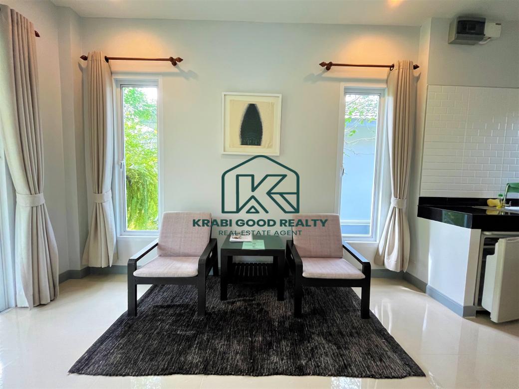 The accommodations are villas and bungalows. Business for sale located in the Aonang area and close to Klong Muang Beach in only 5 minutes. Three-bedroom villa and 5-Bungalow connecting with a communal salt swimming pool for both children and adults size of 5.2*15.6 meters. There is a sunbathing area that feels like being by the sea. Overlooking the view of coconut trees and surrounded by many trees that make the atmosphere shady. Suitable for investors who want to own a beautiful and private property. This property features two-story three bedroom villas, five bungalows, and a one-story raised studio.