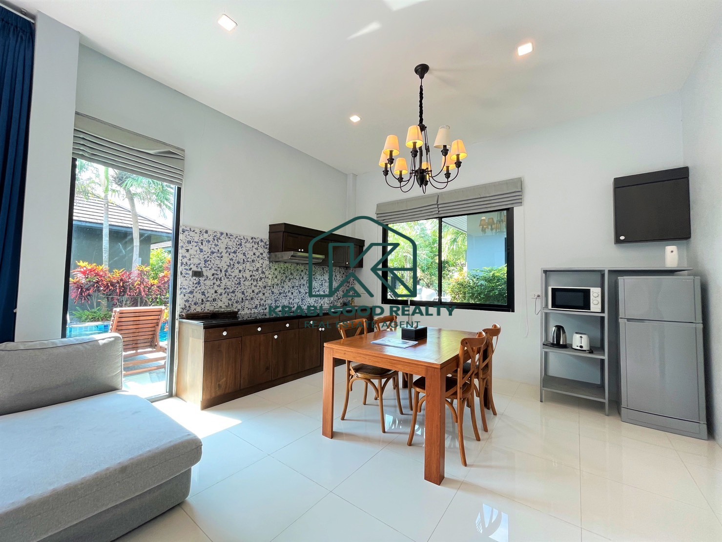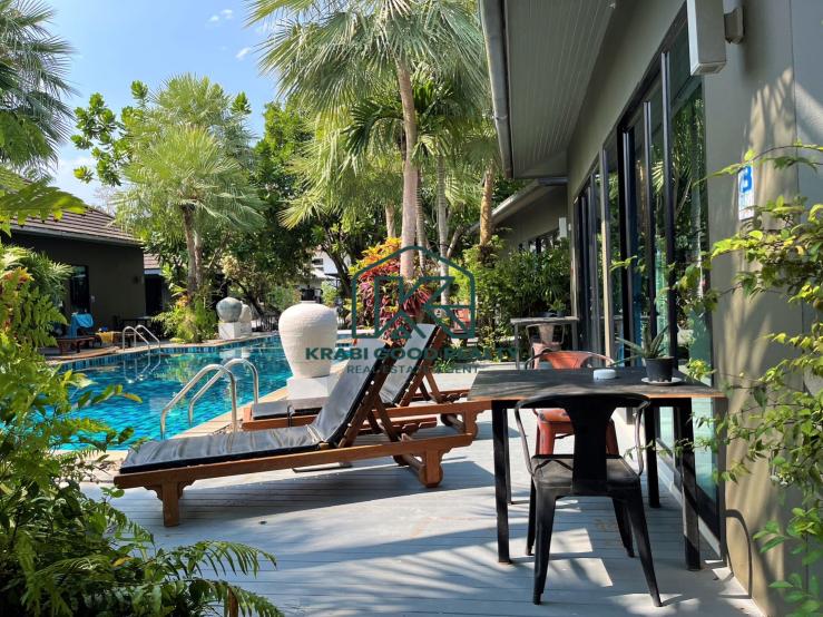 This is a one-story small-family home in Aonang. It has two large bedrooms, all with ensuite baths, and all bedrooms have built-in wardrobes and air conditioning. The windows are large and let lots of outside sunshine in. The living area of 50 sq. m. overlooks the beautiful and peaceful common gardens and swimming pool. open-plan living with wood furniture, a comfortable sofa, chairs, and a flat-screen TV, and dining areas with a western kitchen with a microwave, toaster, refrigerator, and electric kettle.