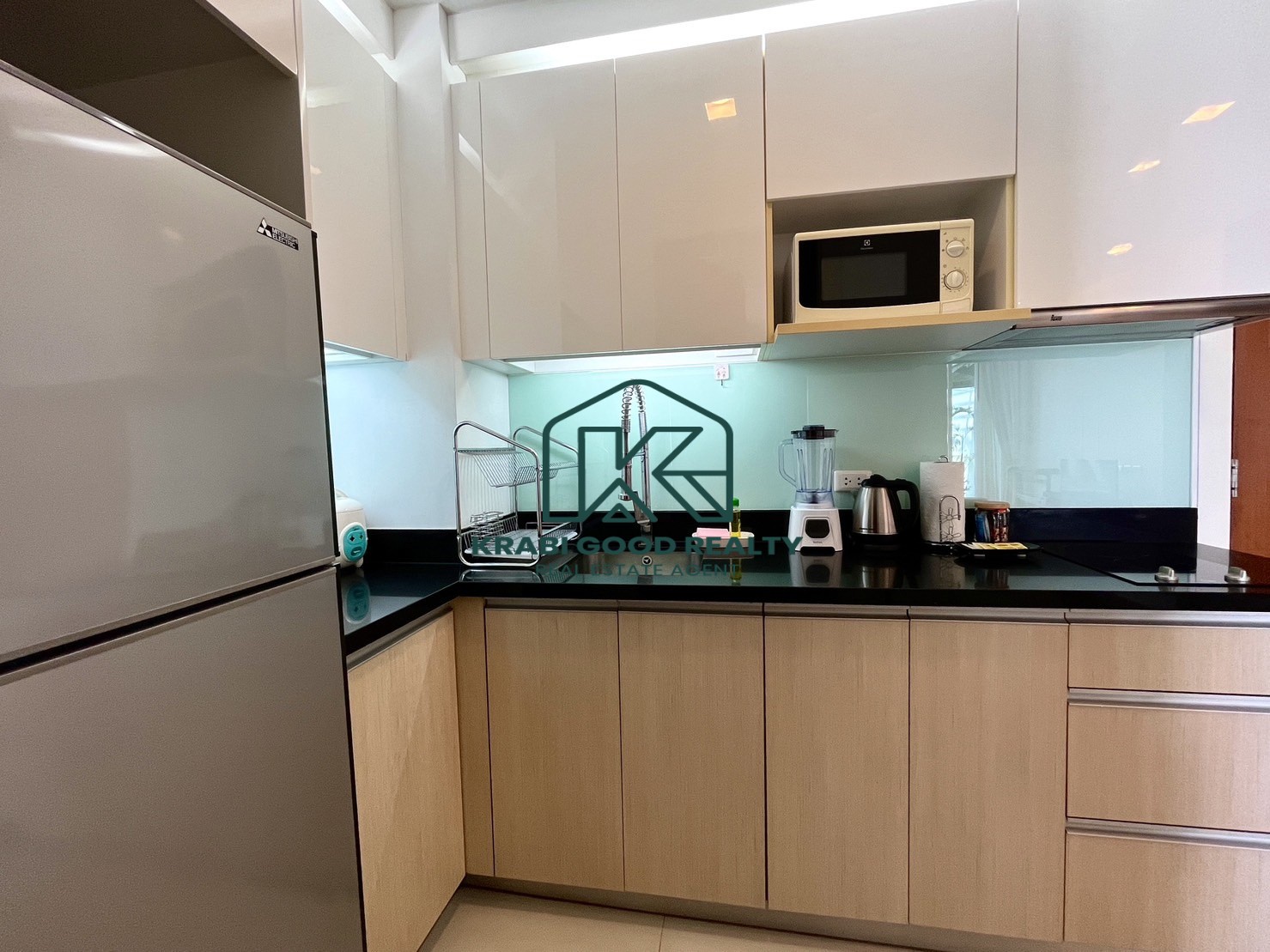 Here, we have a swimming pool to enjoy in the privacy of the room by creating a private swimming pool on the balcony of the room without having to reconcile with the common pool for us to lie down and enjoy the view on the balcony. The interior of the room is simply decorated, comprising bedrooms, and the pool view is large and sunny. There are built-in wardrobes and an ensuite bathroom. The living room is perfect for entertaining with a sofa and TV. The dining area sits adjacent to the kitchen. The kitchen is fully equipped and has all the necessary appliances, including a stovetop, refrigerator, microwave, coffee maker, rice cooker, toaster, fruit blender, and electric kettle.