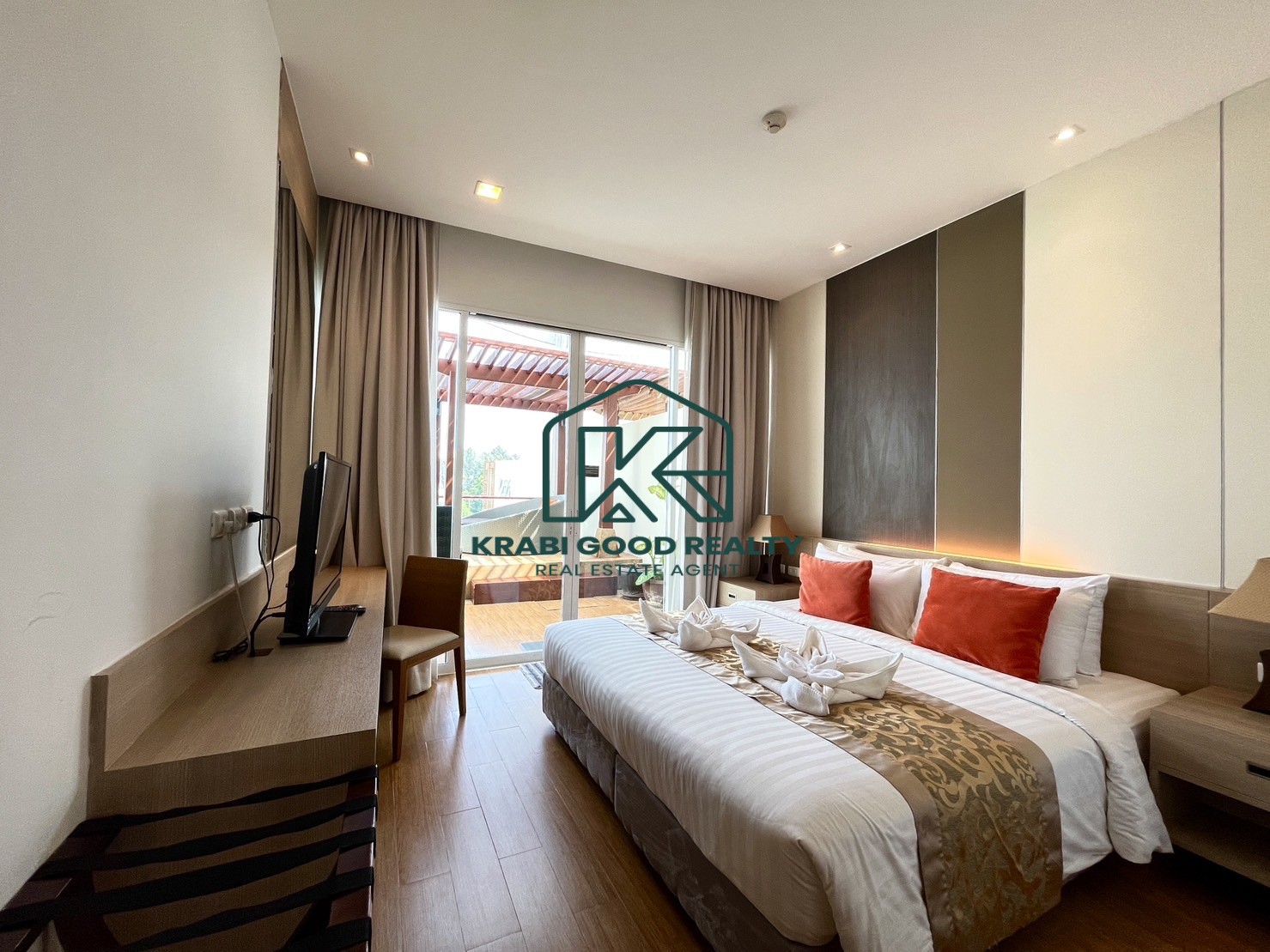 One-bedroom luxury condo with a private swimming pool for sale in Nong Thale, Krabi It can be bought for investment, rented out, or bought for your offspring to live by themselves. This condo is in a fantastic location and is only a five-minute walk to Beach. At 83 square meters. And the central area is up to 6 rai, with the highlight being the infinity pool, which is over 100 meters long and connects residential buildings together. It is a perfect design.