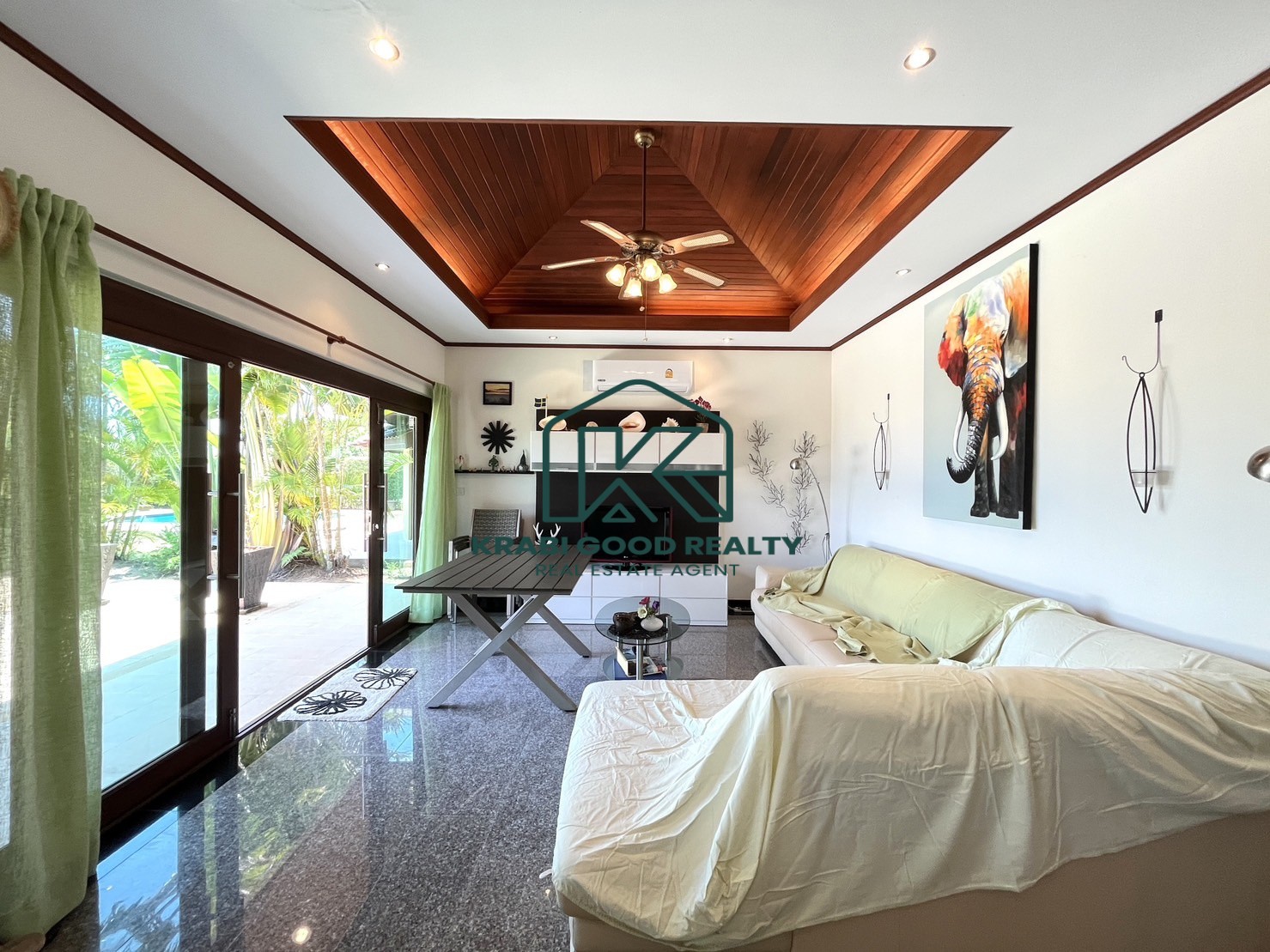 Experience a private holiday atmosphere in the whole house. The land size is 584 square meters, which consists of 2 bedrooms, 2 bathrooms, a living area, a dining area, and a kitchen, complete with amenities such as air conditioning, TV, refrigerator, oven, dishwasher, and microwave. The pool villas also have outdoor areas such as gardens, picnic areas, and terraces, as well as private outdoor pools with a size of 3*8 meters for endless enjoyment within the residence and Thai Sala near the beach to be able to see panoramic views. Watch the beautiful sunset.