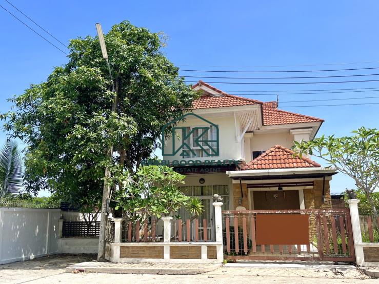 A two-story house for sale designed in a modern, elegant style with a lawn next to the house The house is very spacious. The land size is 208 square meters, and the usable area is 180 square meters. The ground floor consists of a living room with a sofa, a TV, and a dining area with a table and chairs. The kitchen is a Western-style kitchen with an equipped refrigerator, a laundry area, a washing machine, and one toilet. open space, long from the front of the house to the back of the house, airy, and comfortable.