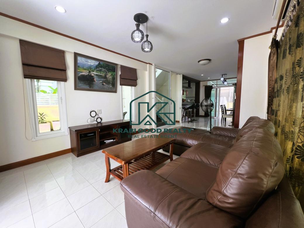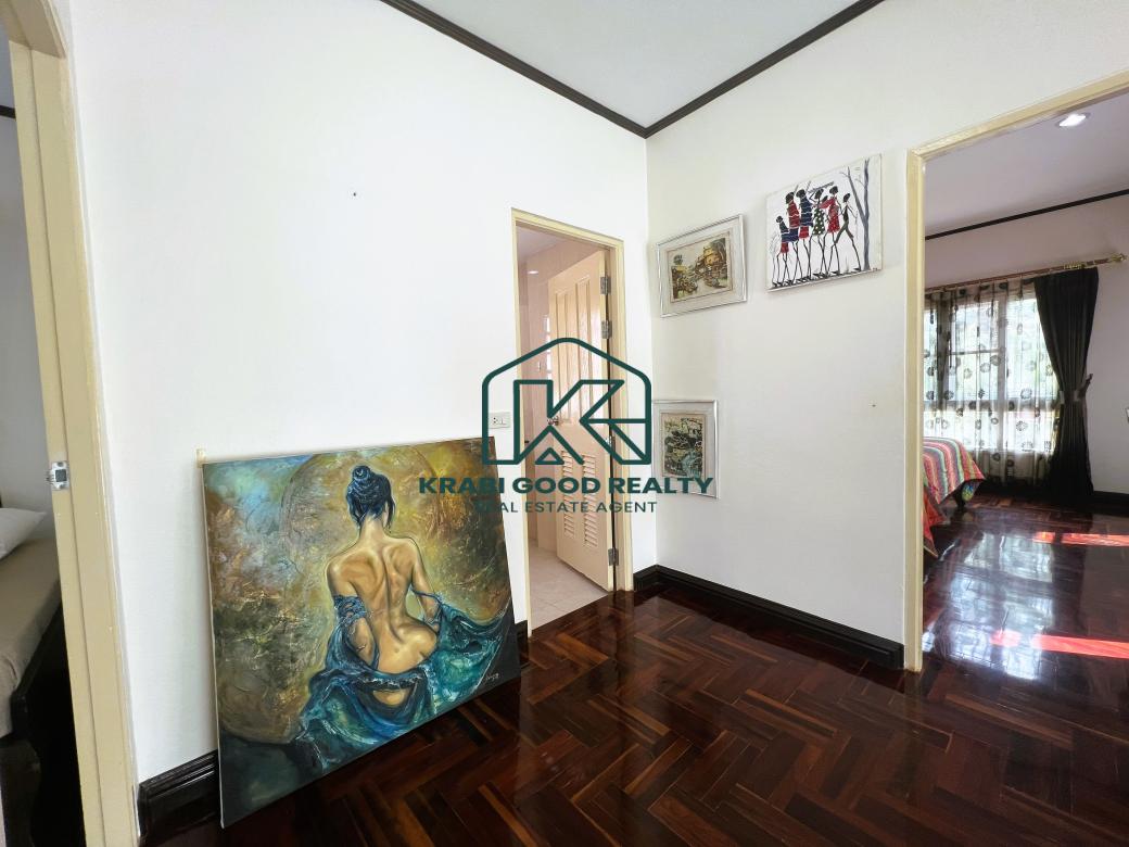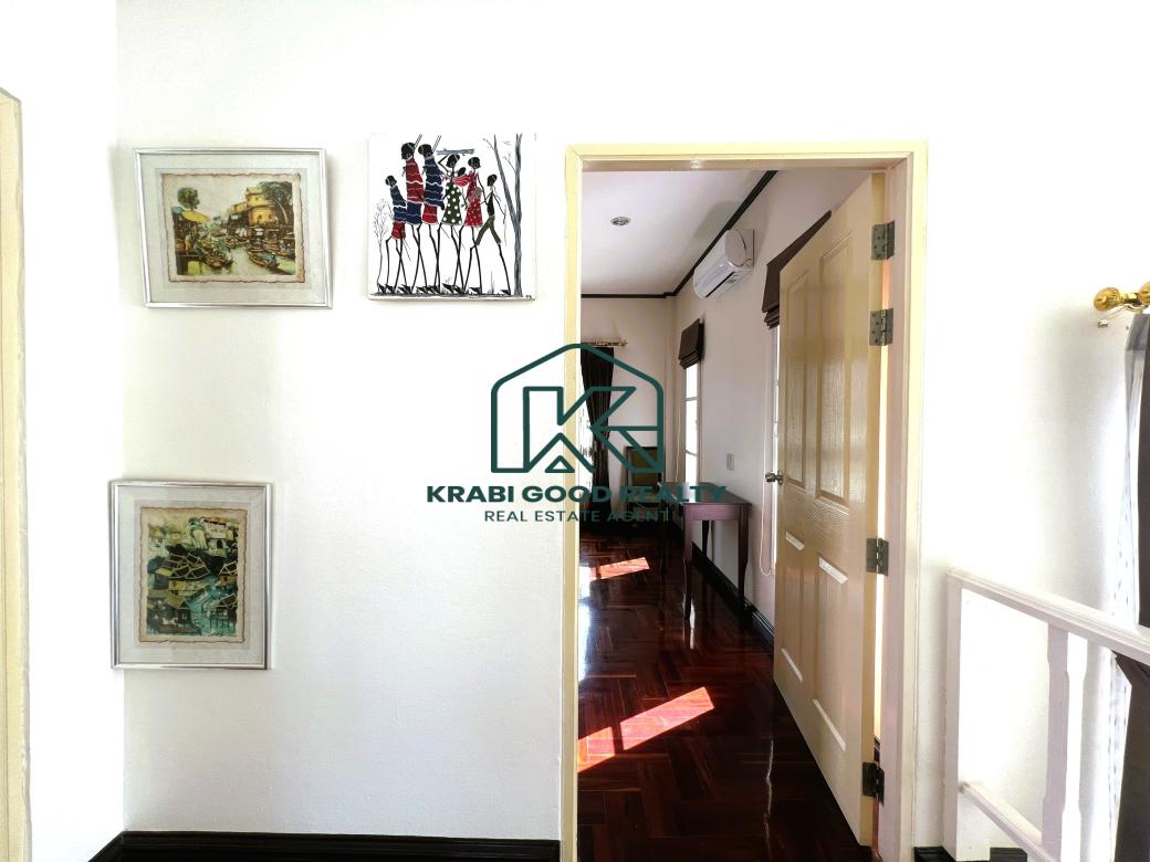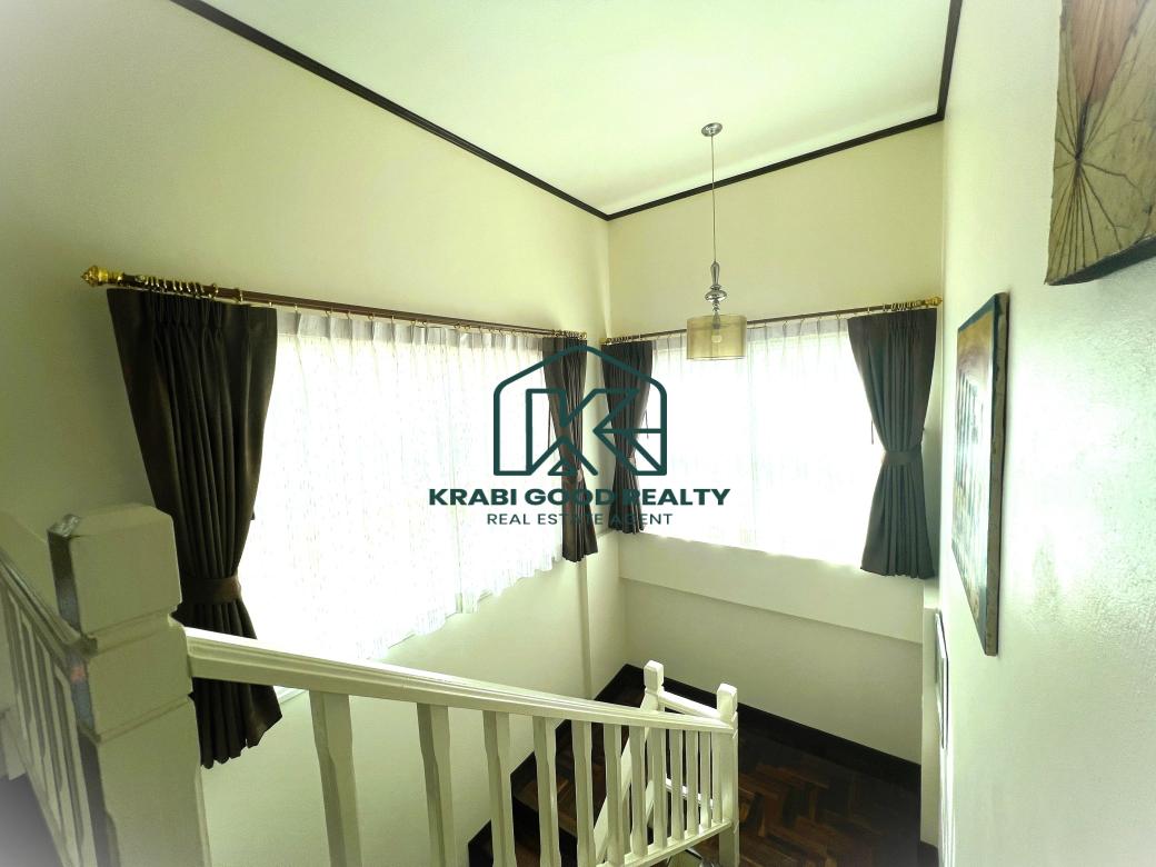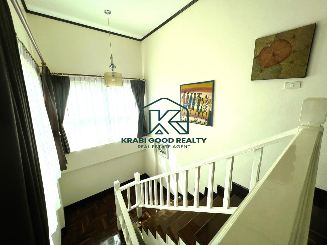 The airy two-story, three-bedroom house with mountain views for sale in Aonang, Krabi, is designed in a modern, elegant style. The house is very spacious. The land size is 268 square meters. The ground floor consists of a living room and a dining area. The kitchen is a Western-style kitchen, there is a laundry area, and there is one bathroom. open space, long from the front of the house to the back of the house, airy, and comfortable. The second floor consists of three bedrooms and a bathroom, which all have city views, mountains, and gardens. This villa is sold unfurnished. Buyers can create their own unique style and design.