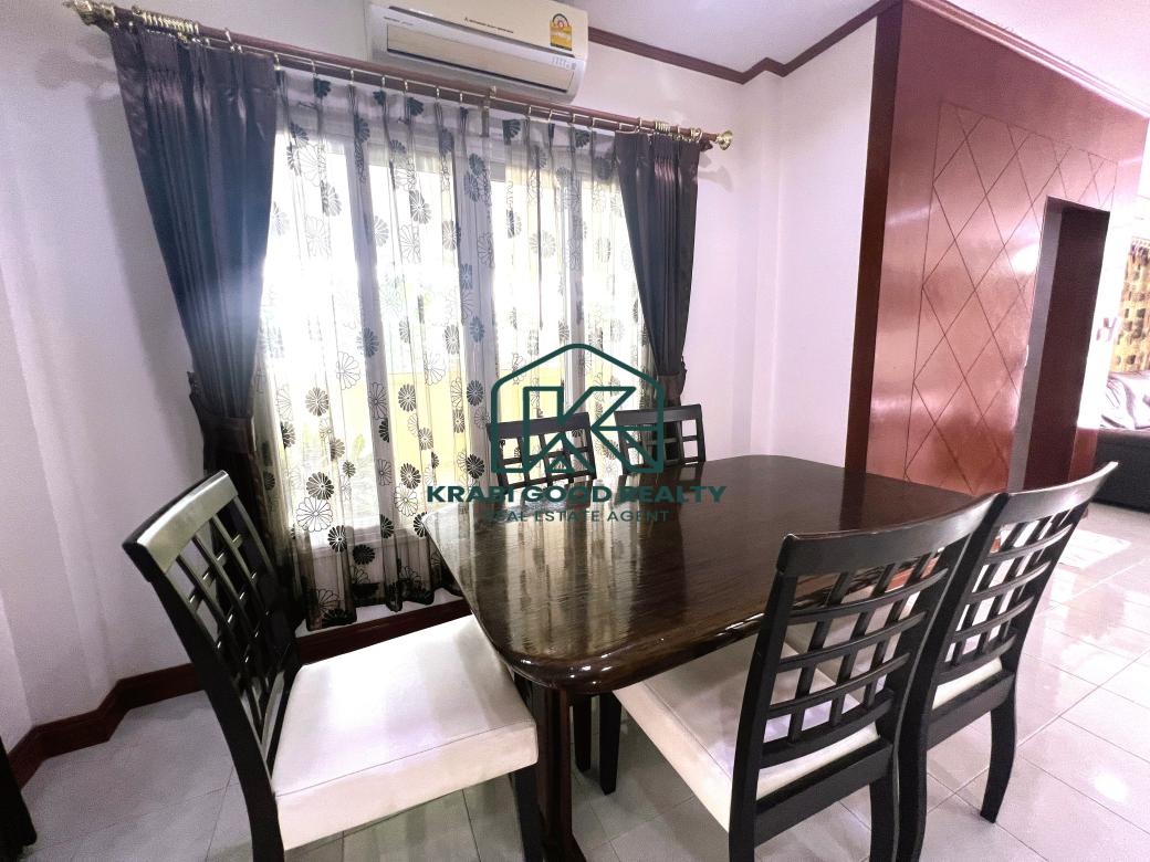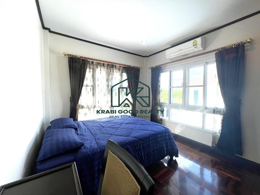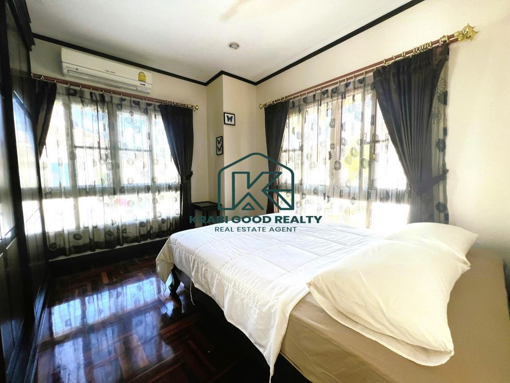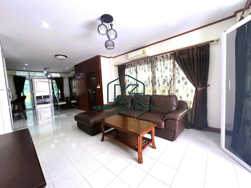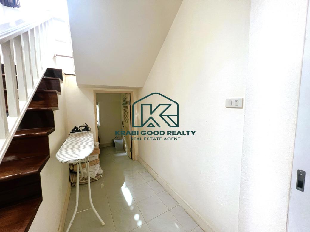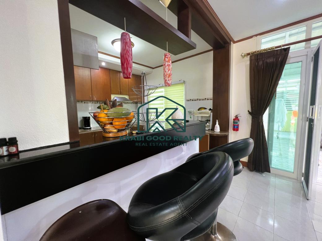 The airy two-story, three-bedroom house with mountain views for sale in Aonang, Krabi, is designed in a modern, elegant style. The house is very spacious. The land size is 268 square meters. The ground floor consists of a living room and a dining area. The kitchen is a Western-style kitchen, there is a laundry area, and there is one bathroom. open space, long from the front of the house to the back of the house, airy, and comfortable. The second floor consists of three bedrooms and a bathroom, which all have city views, mountains, and gardens. This villa is sold unfurnished. Buyers can create their own unique style and design.