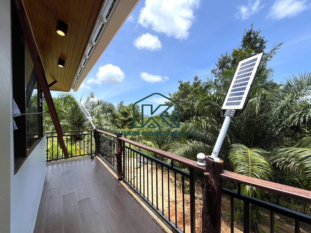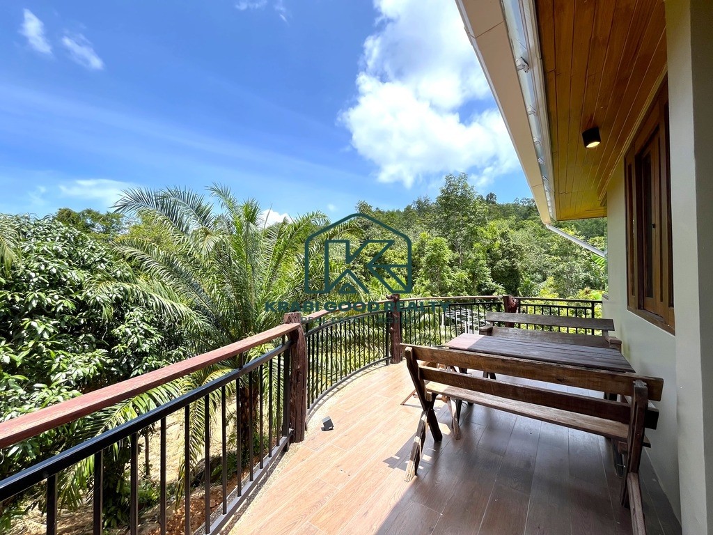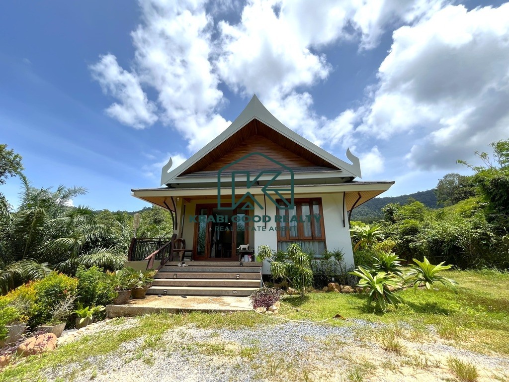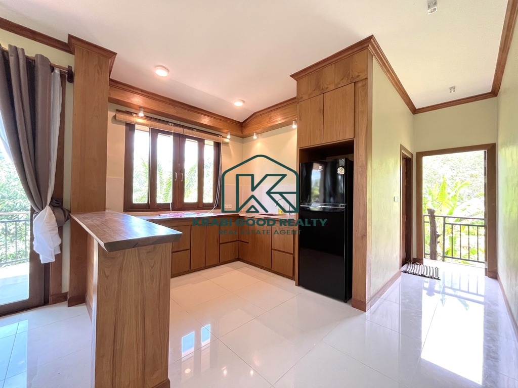 Discover a modern 2-bedroom Thai-style house in Aonang, Krabi, offering stunning mountain views. The design is tailored to the topography and climate, featuring an open space beneath the house to allow for cooling breezes, reducing humidity and water damage. The ground floor includes a basement for storage, while the first floor comprises 2 bedrooms, 2 bathrooms, a living room, kitchen with dining area, and a rear washing balcony. Surrounded by a palm plantation, the property offers potential for expansion with a swimming pool or garden. Contact us for more information on this property.