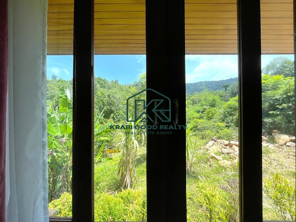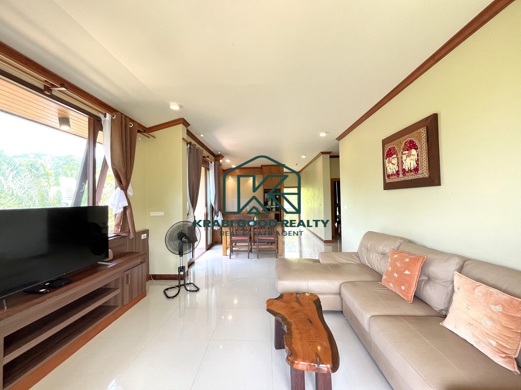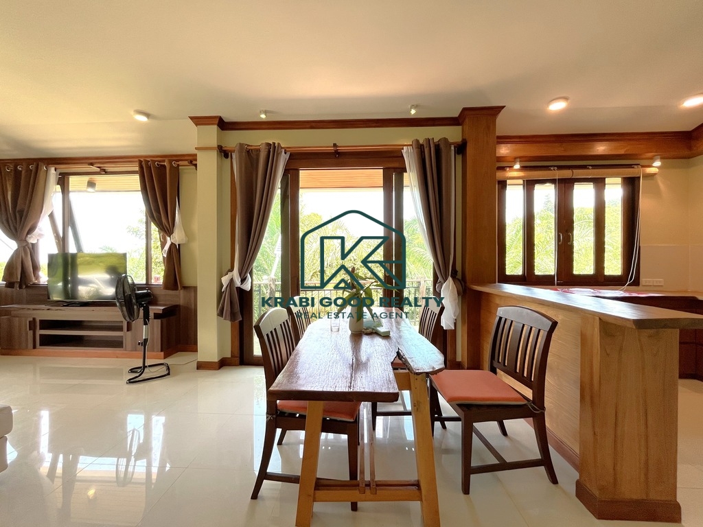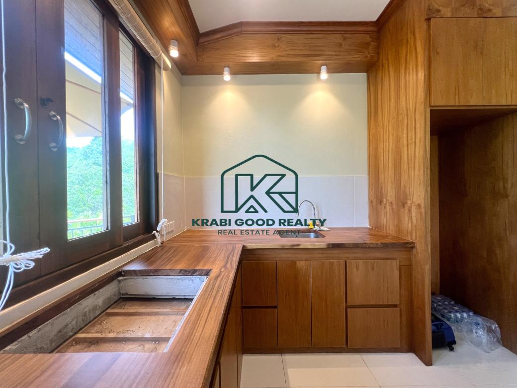 Discover a modern 2-bedroom Thai-style house in Aonang, Krabi, offering stunning mountain views. The design is tailored to the topography and climate, featuring an open space beneath the house to allow for cooling breezes, reducing humidity and water damage. The ground floor includes a basement for storage, while the first floor comprises 2 bedrooms, 2 bathrooms, a living room, kitchen with dining area, and a rear washing balcony. Surrounded by a palm plantation, the property offers potential for expansion with a swimming pool or garden. Contact us for more information on this property.