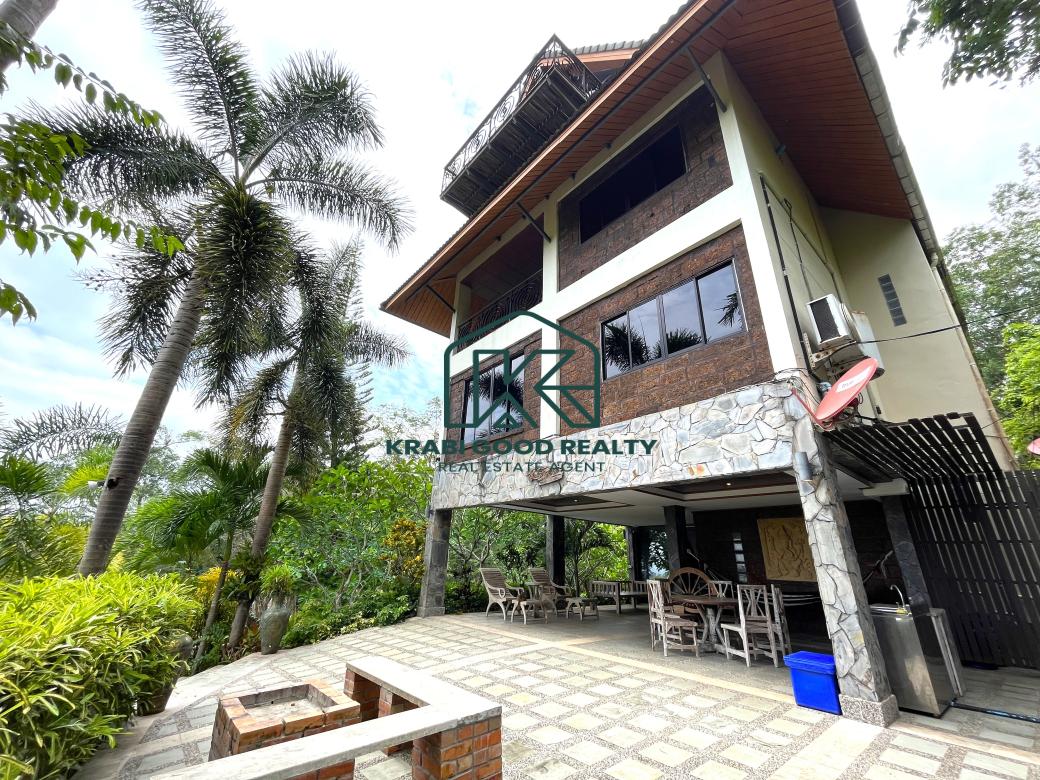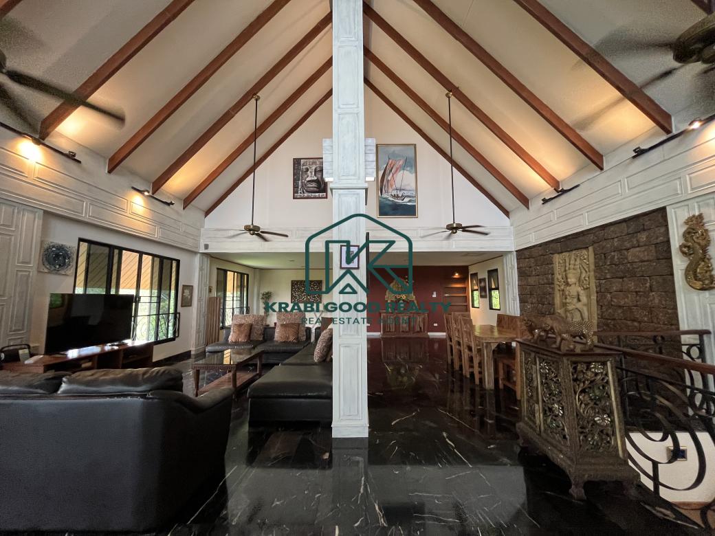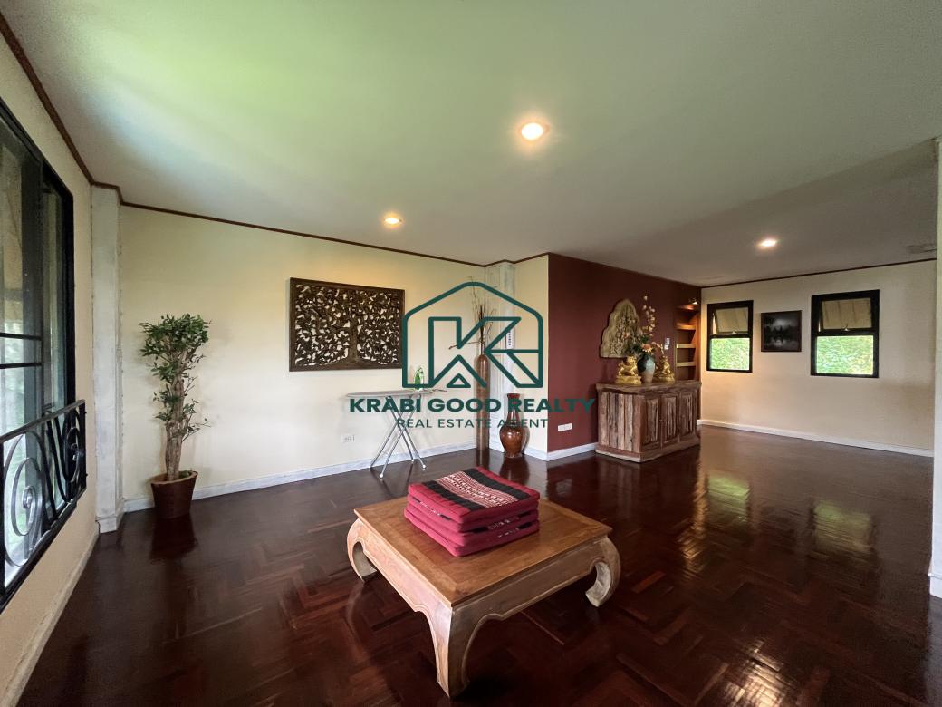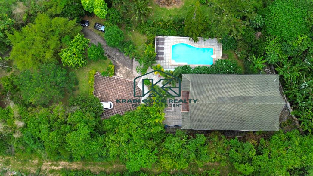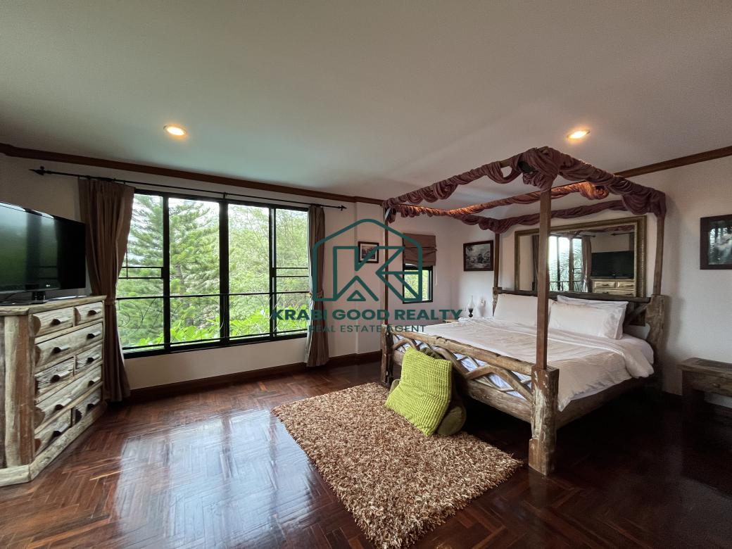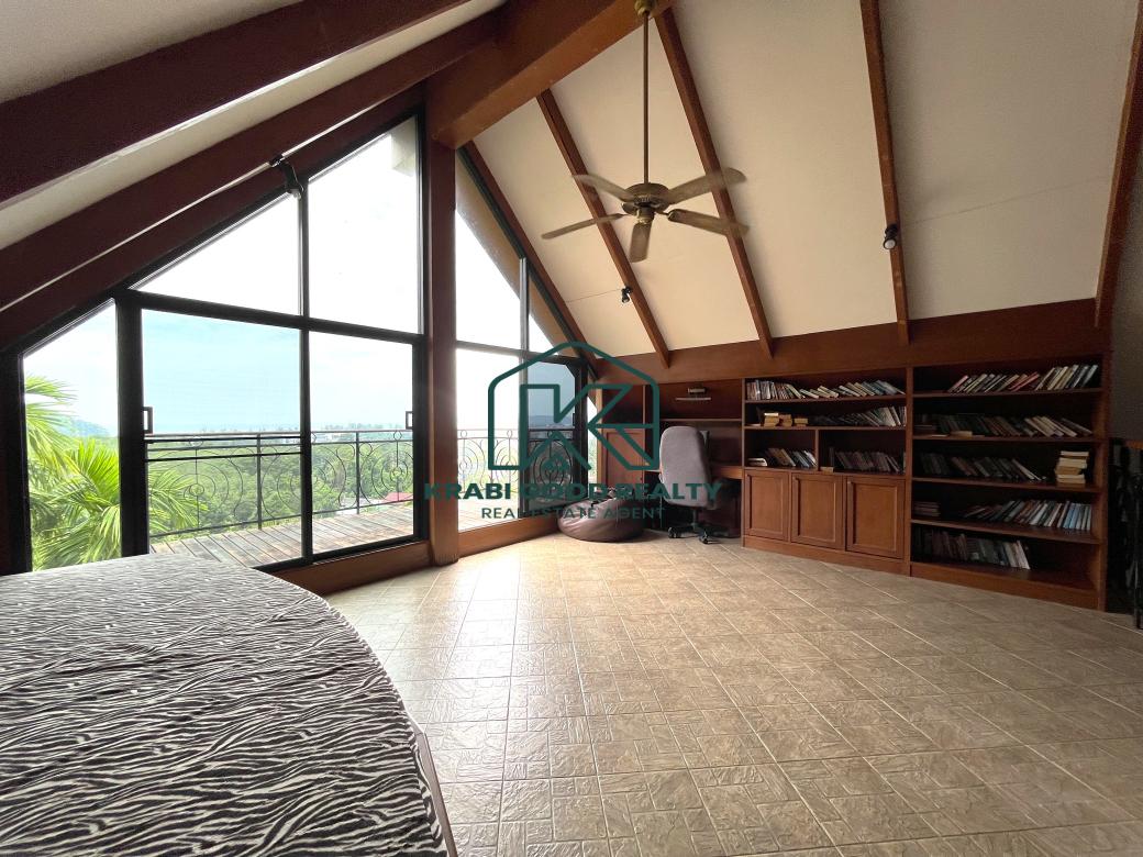 5 bedroom villa investment opportunity with sea view for sale Near Ao Nang Beach, Krabi This unique and imposing three-floor resort with stunning sea views stands at the summit of a very steep hill, surrounded by a vast garden of terraced lawns and tropical foliage. Privacy assured. The villa is located approximately 2 km from Ao Nang Beach. On the ground floor, the shaded garden terrace offers a sink counter and barbecue equipment, while to the side of the house, overlooking the countryside, sits a 10 X 4.5 meters swimming pool with a surround deck and sun loungers.