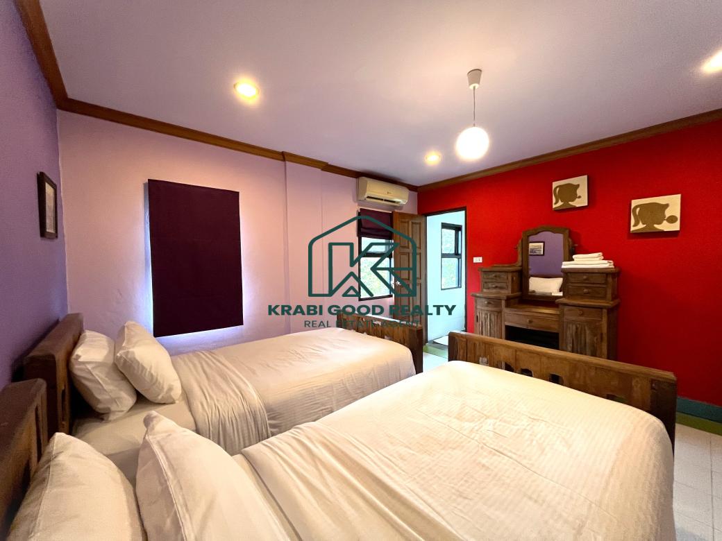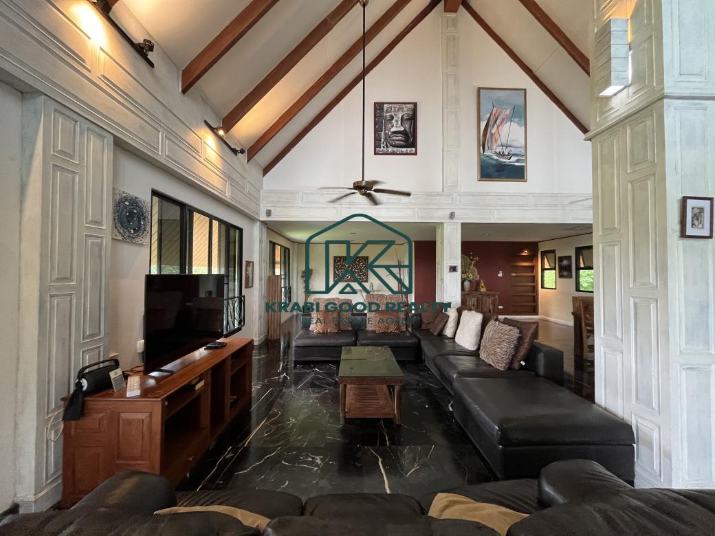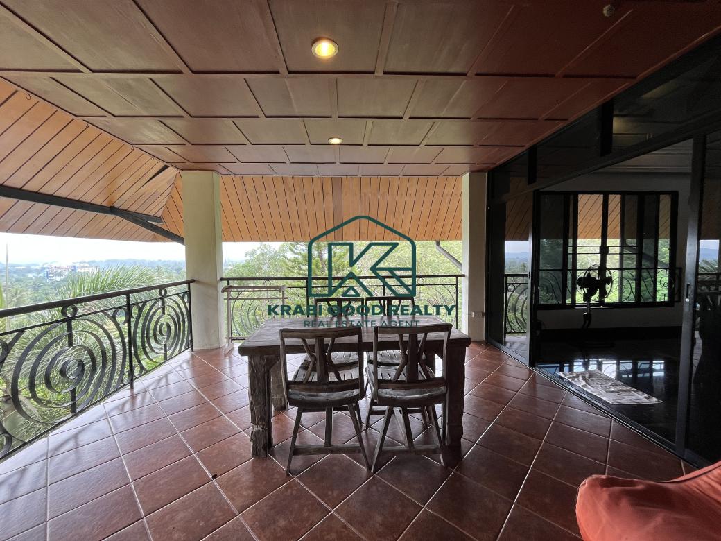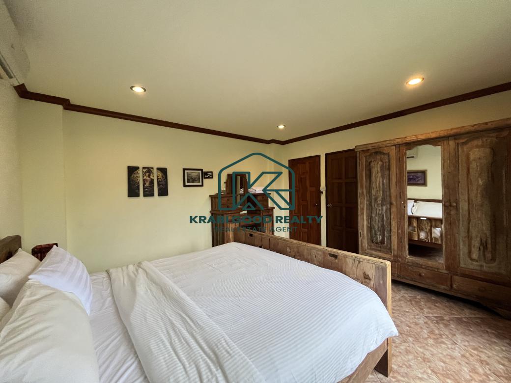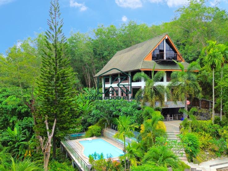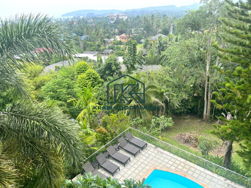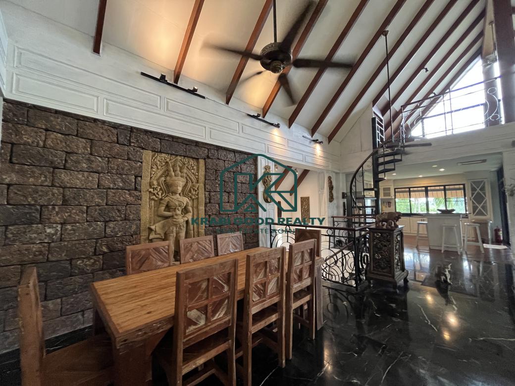 5 bedroom villa investment opportunity with sea view for sale Near Ao Nang Beach, Krabi This unique and imposing three-floor resort with stunning sea views stands at the summit of a very steep hill, surrounded by a vast garden of terraced lawns and tropical foliage. Privacy assured. The villa is located approximately 2 km from Ao Nang Beach. On the ground floor, the shaded garden terrace offers a sink counter and barbecue equipment, while to the side of the house, overlooking the countryside, sits a 10 X 4.5 meters swimming pool with a surround deck and sun loungers.