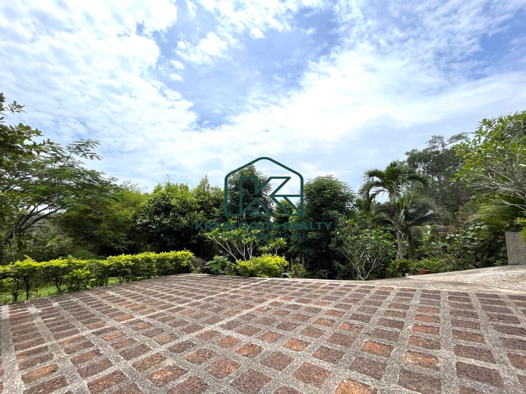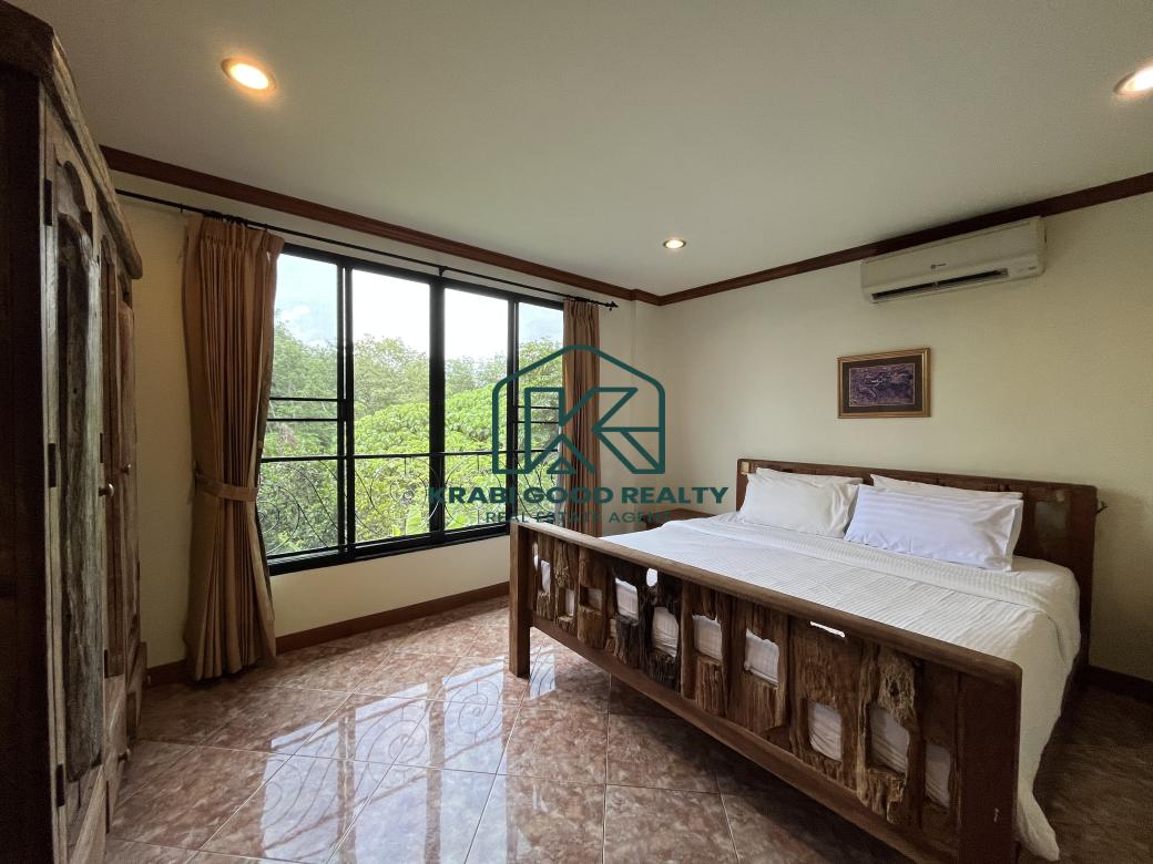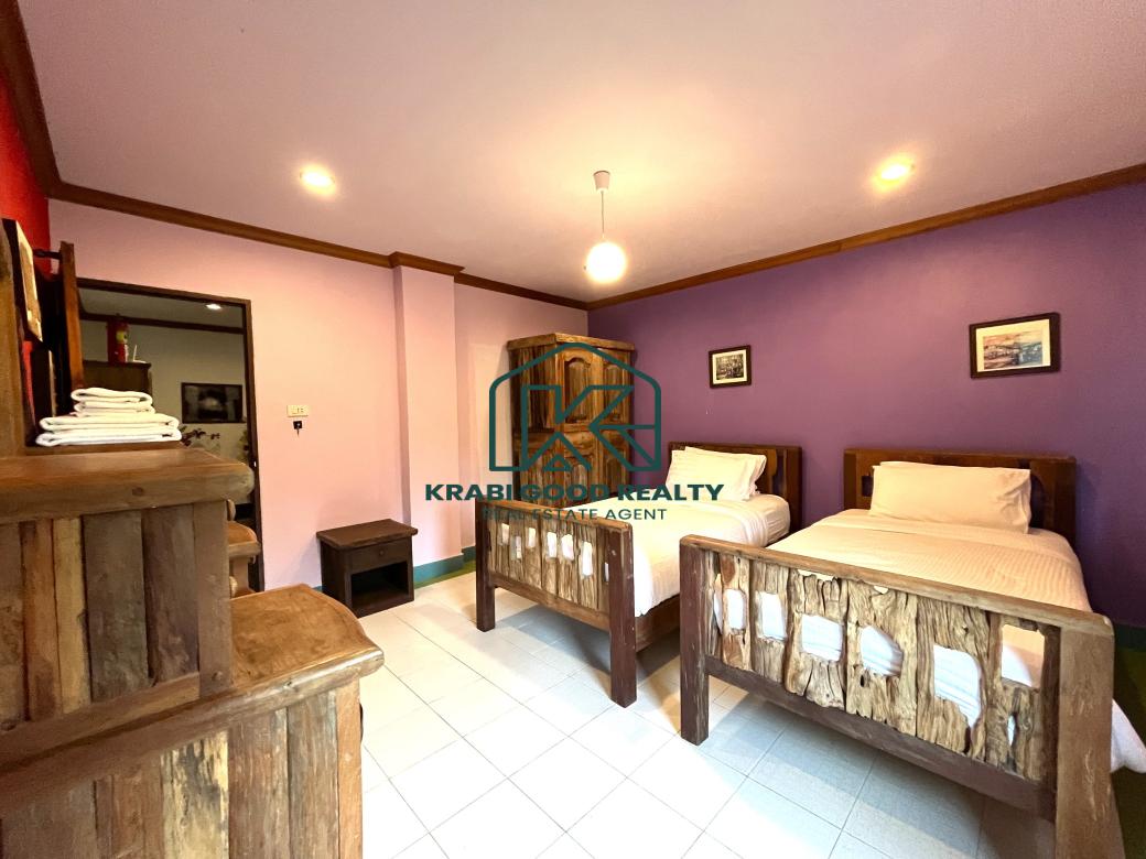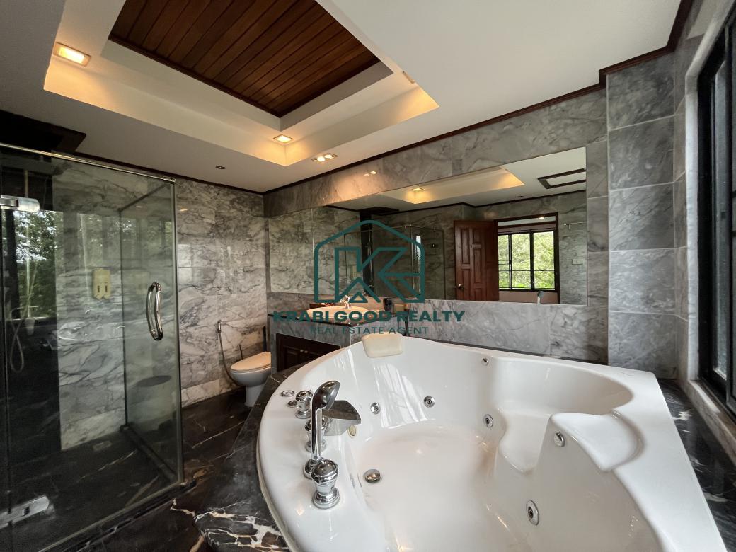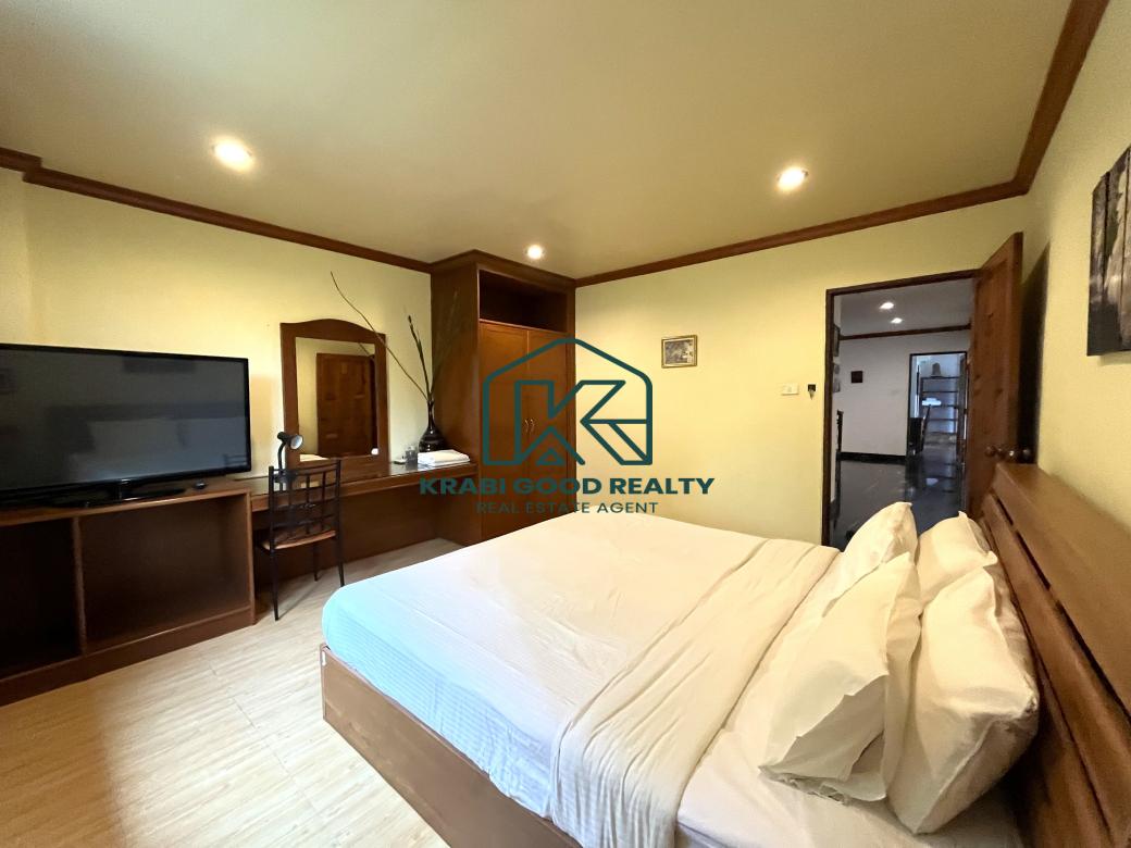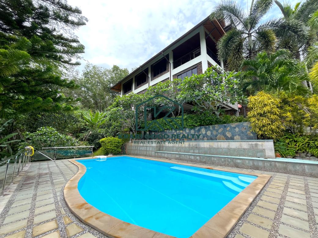 5 bedroom villa investment opportunity with sea view for sale Near Ao Nang Beach, Krabi This unique and imposing three-floor resort with stunning sea views stands at the summit of a very steep hill, surrounded by a vast garden of terraced lawns and tropical foliage. Privacy assured. The villa is located approximately 2 km from Ao Nang Beach. On the ground floor, the shaded garden terrace offers a sink counter and barbecue equipment, while to the side of the house, overlooking the countryside, sits a 10 X 4.5 meters swimming pool with a surround deck and sun loungers.