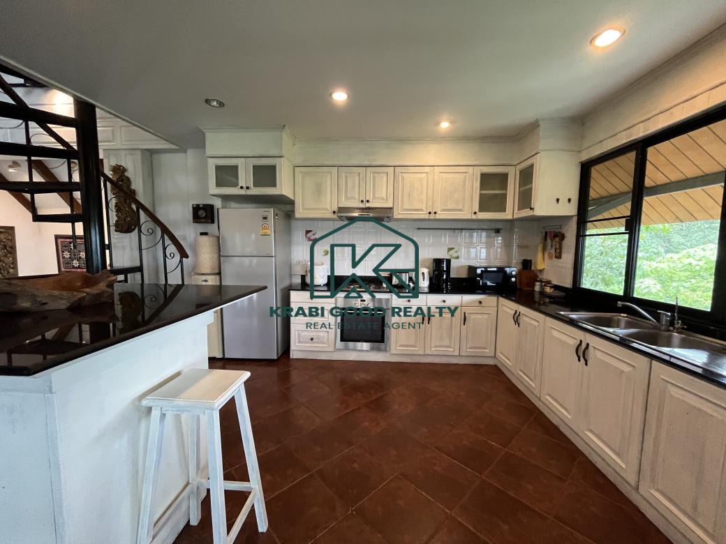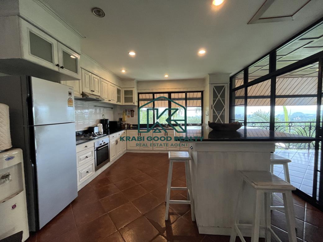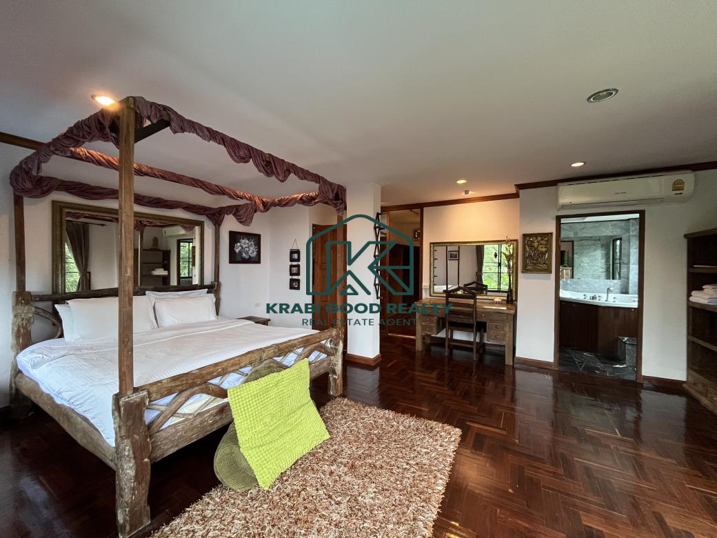 โอกาสในการลงทุนวิลล่า 5 ห้องนอนพร้อมวิวทะเลสำหรับขาย ใกล้หาดอ่าวนาง กระบี่ รีสอร์ท 3 ชั้นที่มีเอกลักษณ์และสง่างามพร้อมวิวทะเลที่สวยงามแห่งนี้ตั้งอยู่บนยอดเขาสูงชันมาก ล้อมรอบด้วยสวนขนาดใหญ่ที่มีสนามหญ้าขั้นบันไดและพันธุ์ไม้เขตร้อน รับประกันความเป็นส่วนตัว วิลล่าตั้งอยู่ห่างจากหาดอ่าวนางประมาณ 2 กม. ที่ชั้นล่าง เฉลียงสวนอันร่มรื่นมีเคาน์เตอร์อ่างล้างจานและอุปกรณ์บาร์บีคิว ขณะที่ด้านข้างของบ้านมองเห็นวิวชนบท มีสระว่ายน้ำขนาด 10 X 4.5 เมตร พร้อมดาดฟ้าล้อมรอบและเก้าอี้อาบแดด