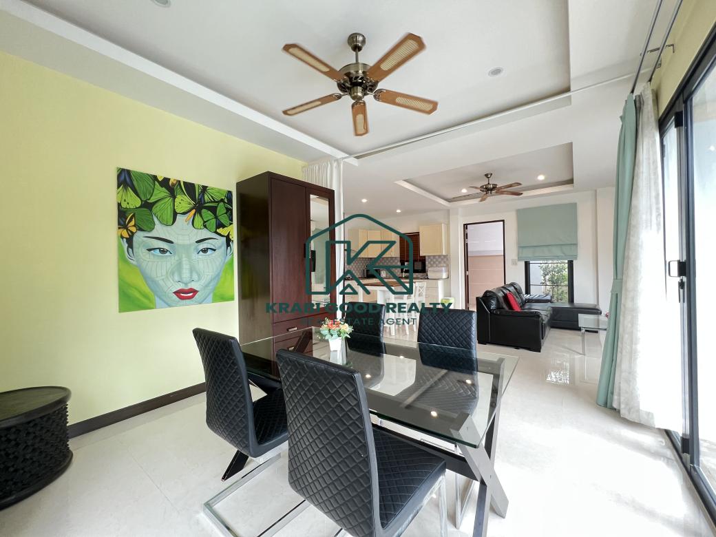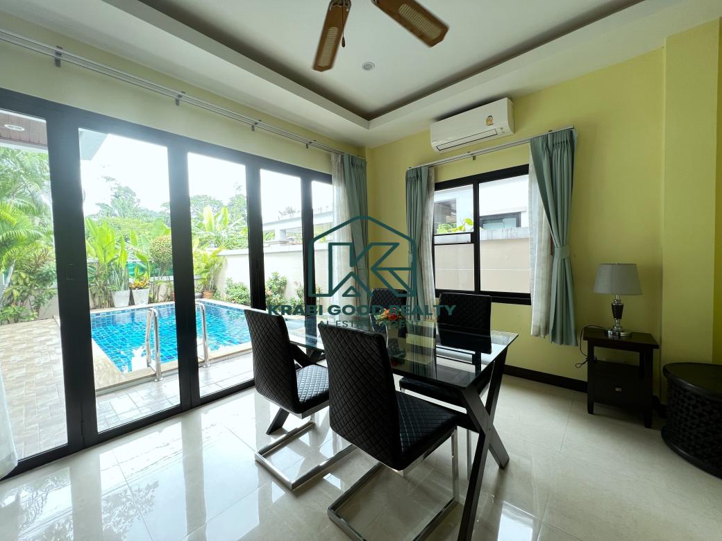 Cozy 2-bedroom pool villa with mountain view for sale in Ao Nang, Krabi. designed to provide comfort, modern amenities, and a stunning mountain view. Situated only 10 minutes away from Ao Nang beach, it offers both convenience and tranquility. The kitchen features a stylish setup with quality appliances, filtered water, and a prep island, ideal for entertaining guests. The dining area offers a picturesque view of the 6m pool, with wide folding doors allowing for tropical breezes throughout the house. The living area is spacious and equipped with a 48-inch Smart TV, Bluetooth stereo, air conditioning, and ceiling fans for comfort, bedrooms both bedrooms are furnished with quality king beds and custom-made modern teak furniture, providing elegance and functionality, bathrooms luxurious rain showers, stylish tiling, and high-quality fixtures enhance the bathrooms, offering a bright and refreshing atmosphere.