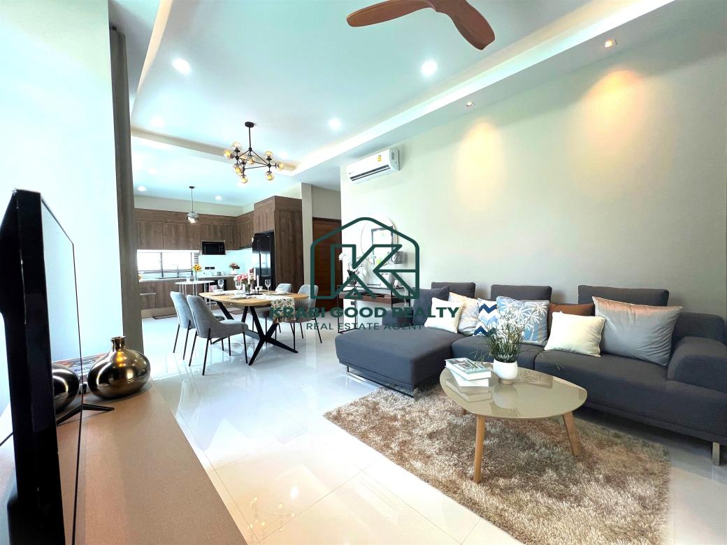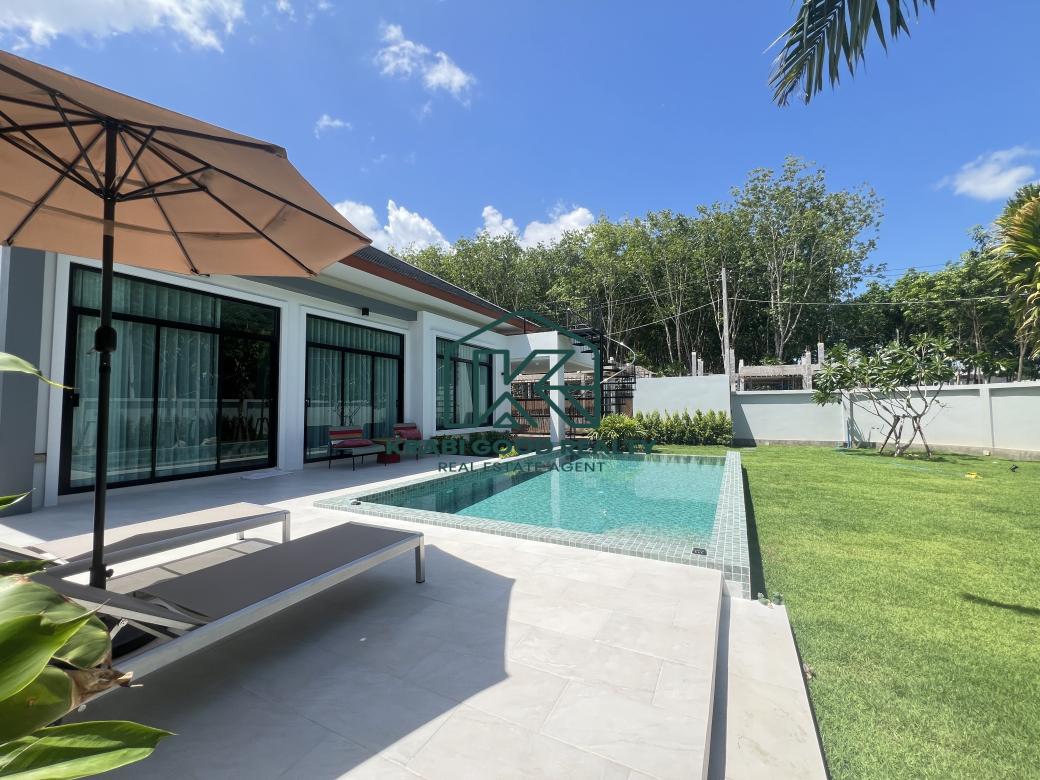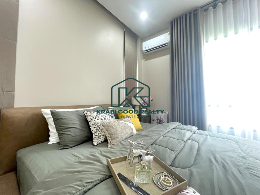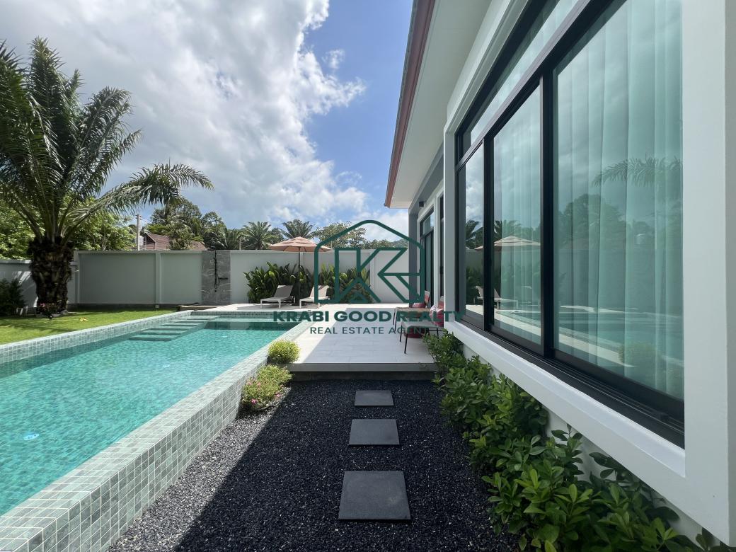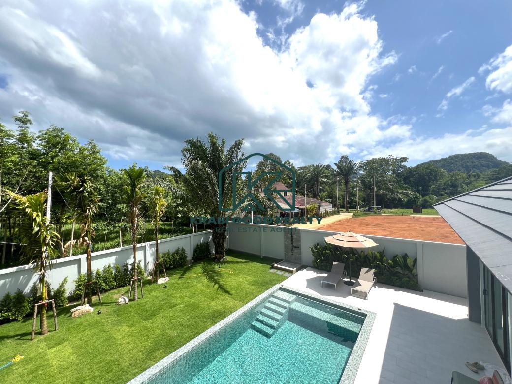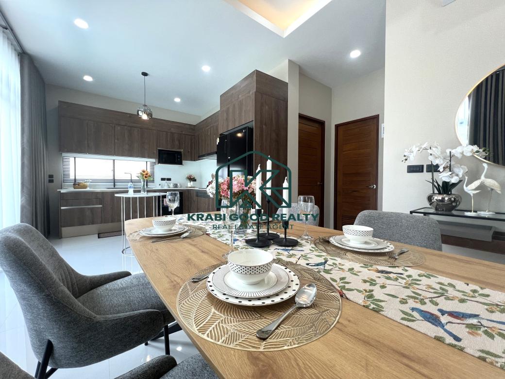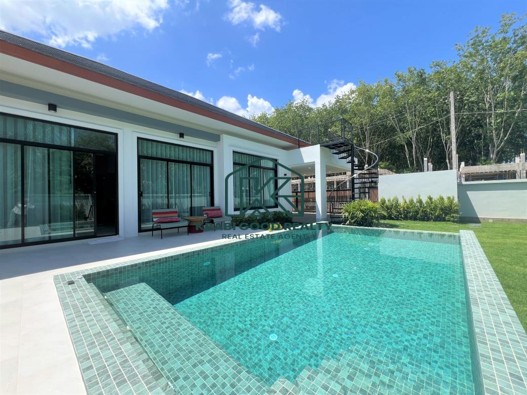 Comfortable pool villa with 2 bedrooms, 2 bathrooms, and a spacious garden for sale in Ao Nang, Krabi. The villa includes 2 bedrooms with bedding sets and air conditioning. The decor blends modernity with luxury. The villa features a saltwater pool measuring 4x7 meters with a depth of 1.30 meters. The European-style kitchen is equipped with a microwave, oven, and cooking area, along with a luxury dining table with 4 seats. The large living room, furnished with a pool view, features a spiral staircase leading to a rooftop deck that offers a 360-degree view of the serene natural surroundings and beautiful mountains, perfect for relaxing and hosting gatherings. The outdoor area includes a spacious lawn with beautifully planted trees. Importantly, the outdoor area comes with a sink counter for convenient picnics, barbecues, and impressive dinners. The covered parking area can accommodate up to 2 cars. Perfect for various family activities and pet-friendly. Don't miss the chance to own a slice of paradise in Ao Nang. Suitable for a small, warm family, a relocating family, and a good investment for a rental business.