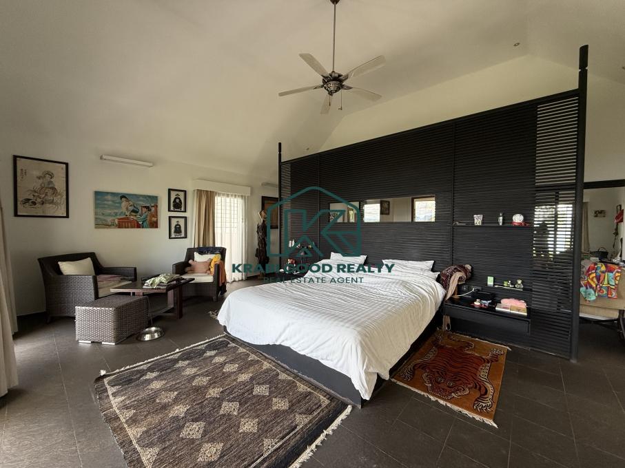 This stunning, secluded luxury villa is nestled in a quiet and private area, facing a beautiful oceanfront view. The main villa features a spacious bedroom, a dedicated office, and an open-concept dining and kitchen area designed for both comfort and elegance. A private pool with surrounding lounge areas provides breathtaking views of the ocean, making it a perfect spot for relaxation. A wooden bridge extends from the villa, adding charm and creating a connection to the surrounding nature. Below, you’ll find four additional bungalows, each with its own private suite, offering exclusive privacy for guests. This villa also offers expansive grounds, perfect for outdoor activities and serene walks.