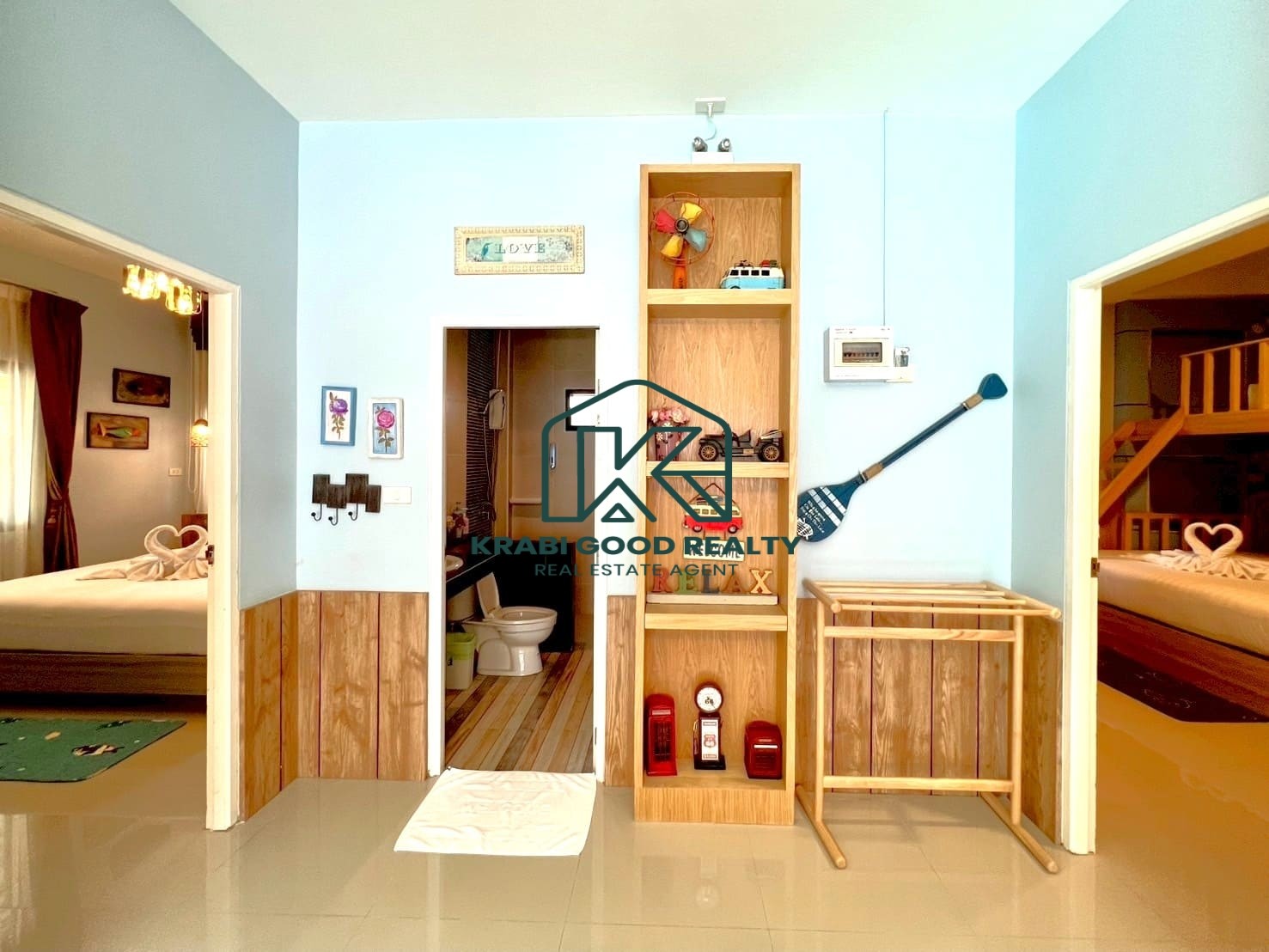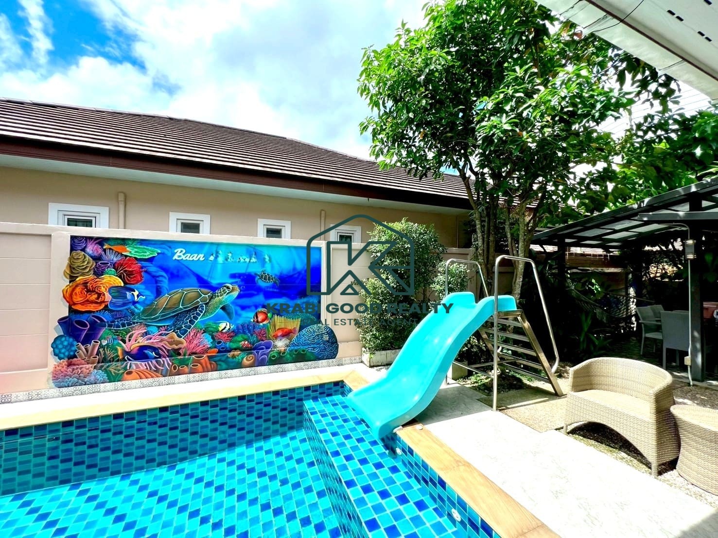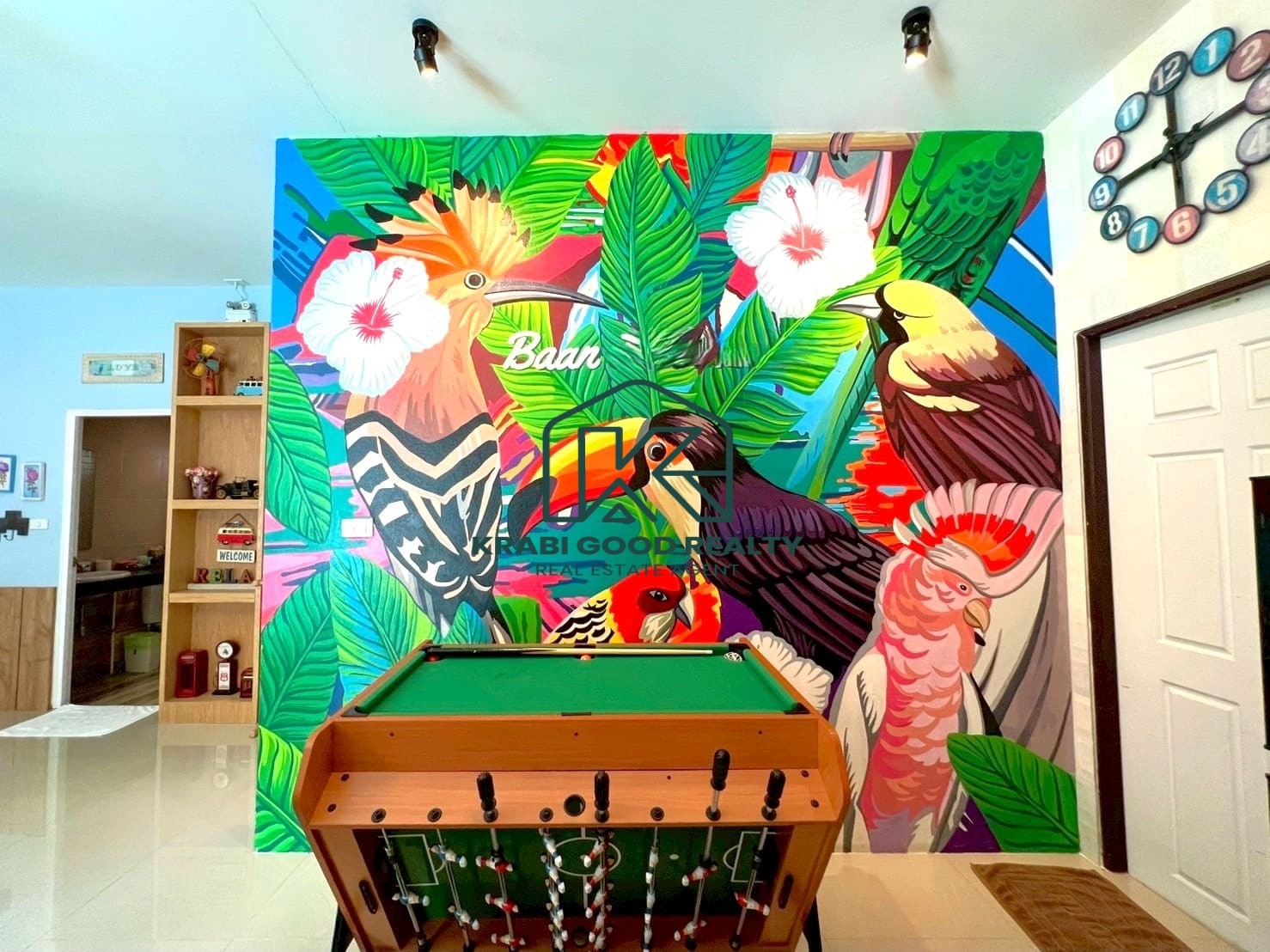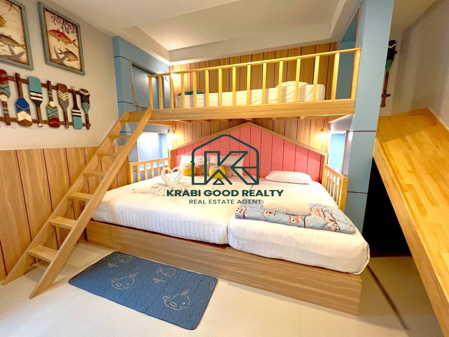 Located in the beautiful area of Ao Nang, Krabi, this 2-bedroom, 2-bathroom villa accommodates up to 6 people and is a truly ideal home for families. Whether you’re looking for a short-term holiday rental or a long-term investment opportunity, this villa is a valuable and versatile choice. The house is fully equipped with thoughtful amenities, designed to cater to both children and adults. A standout feature is the slider bed, perfect for kids to enjoy endless fun and create unforgettable memories. There's also a mini pool table corner, ideal for lively game nights with family or friends.