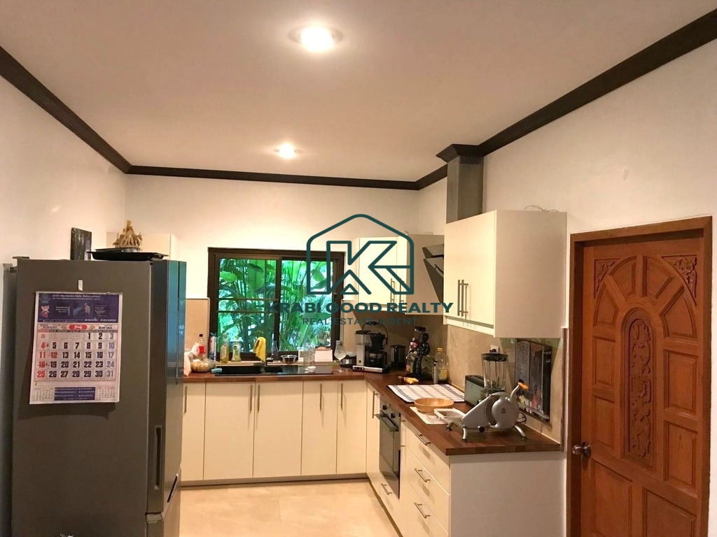 A separate laundry room is included, equipped with a brand-new washing machine and dryer, ready for immediate use. The garden area surrounding the house is lush and planted with various fruit trees such as lime, mango, and other tropical fruits, creating a serene and natural atmosphere.