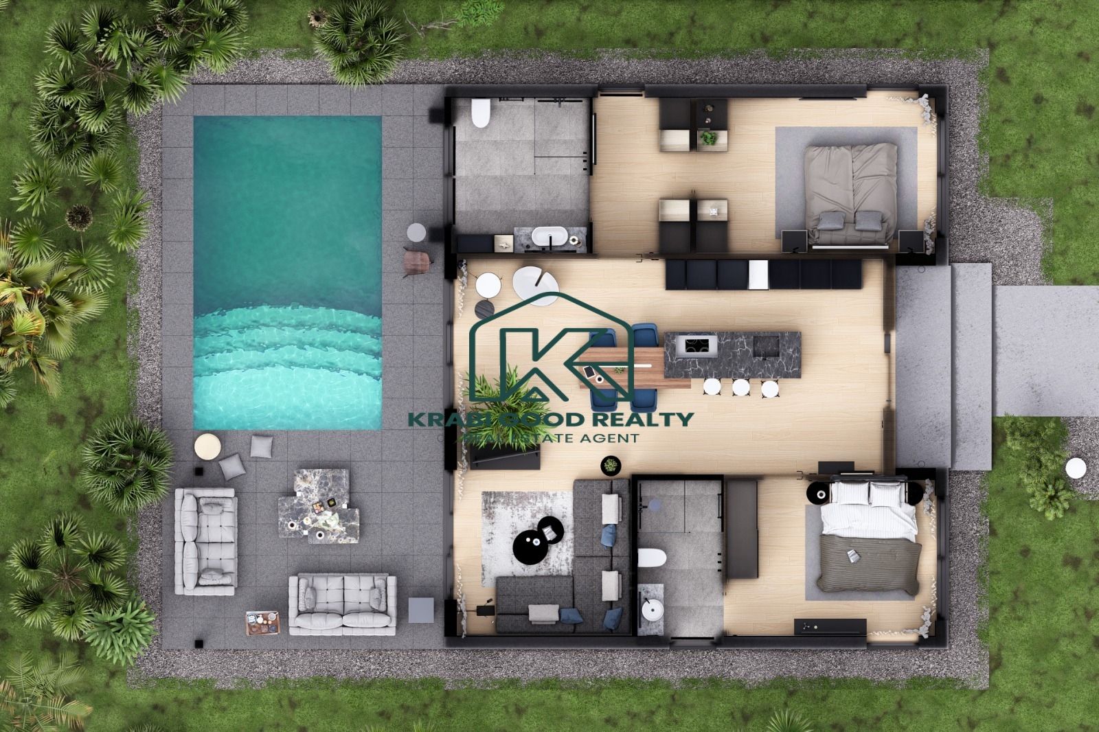 วิลล่าแต่ละหลังมีการออกแบบแปลนอย่างลงตัว ประกอบด้วย 2 ห้องนอน 2 ห้องน้ำ ห้องครัวที่ติดตั้งอุปกรณ์ครบครัน ห้องนั่งเล่นกว้างขวาง พร้อมสระว่ายน้ำส่วนตัวขนาด 4.5 x 7 เมตร ลึก 1.5 เมตร และระเบียงสำหรับพักผ่อน นอกจากนี้ยังมีที่จอดรถส่วนกลางสำหรับผู้พักอาศัย