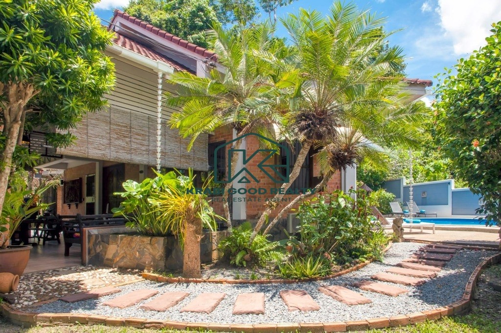 The main house spans 130 sqm and is complemented by two separate bungalows, each 50 sqm in size, providing privacy for family members or visiting guests. A 9 x 4.5-meter saltwater swimming pool with an integrated jacuzzi invites relaxation, while a spacious 60 sqm terrace offers the perfect space for entertaining or unwinding. A serene fish pond adds a touch of tranquility to the lush tropical surroundings, with breathtaking limestone mountain views completing the scene.