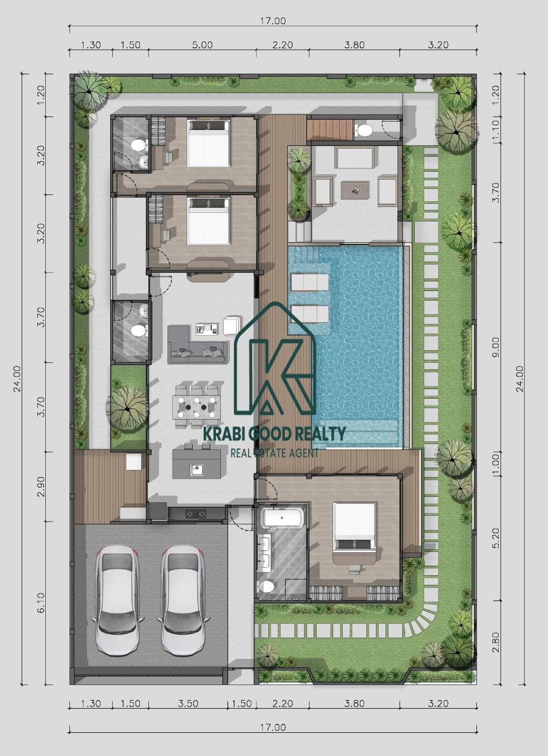 วิลล่าหลังนี้มาพร้อมกับ 3 ห้องนอน 3 ห้องน้ำ ที่จอดรถ 2 คัน สระว่ายน้ำส่วนตัว ดาดฟ้า ห้องนั่งเล่นกว้างขวาง ห้องครัว และสวนจัดแต่งอย่างลงตัว ออกแบบเพื่อความสะดวกสบายทันสมัย พร้อมด้วยประตูรีโมทและกล้องวงจรปิด 4 จุด เพื่อเพิ่มความสะดวกและปลอดภัยให้กับผู้อยู่อาศัย
