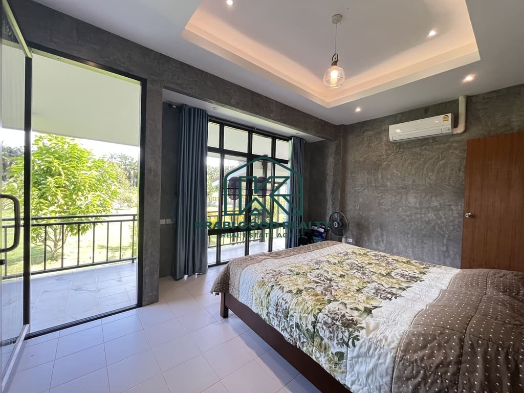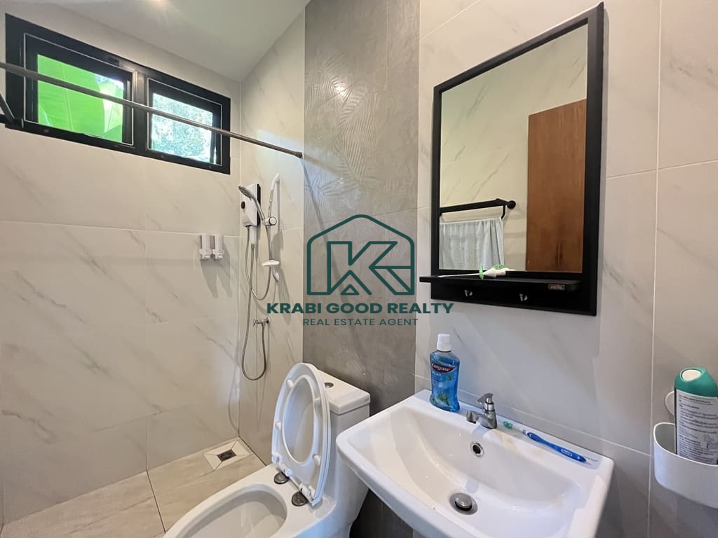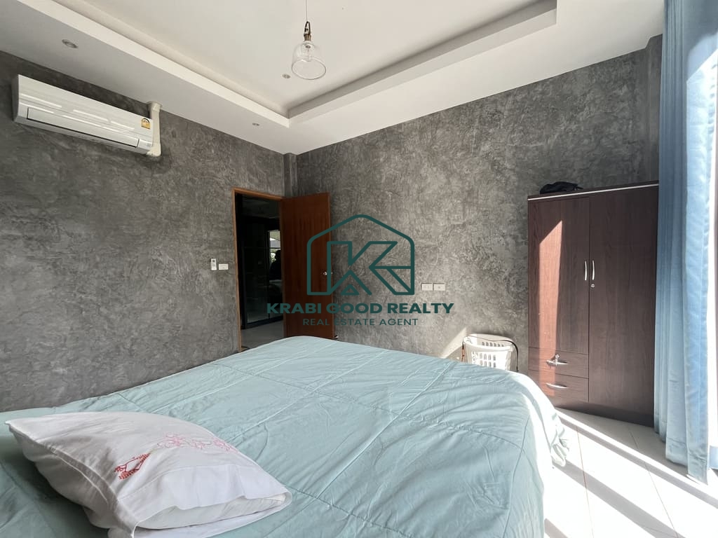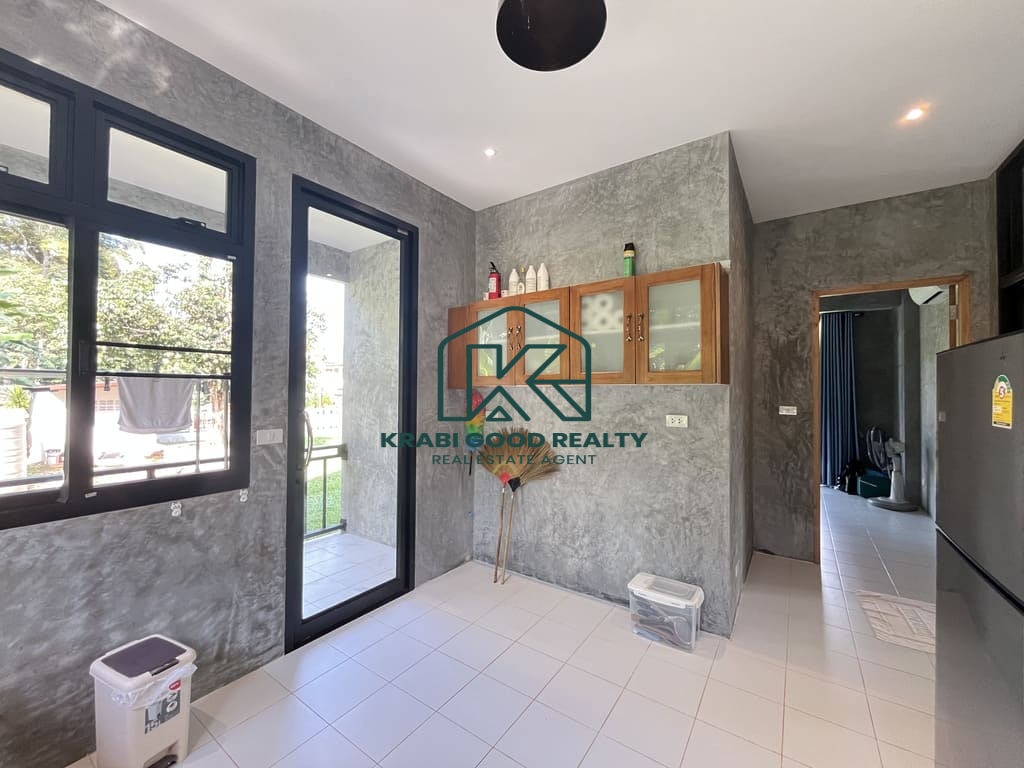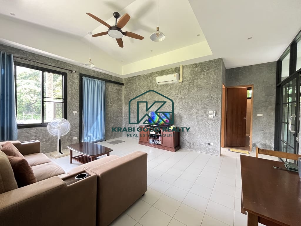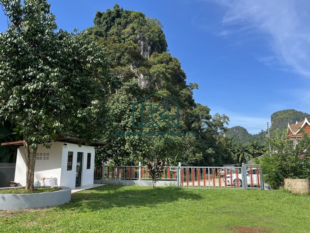A modern 2-bedroom, 2-bathroom home for rent, complete with a fully equipped kitchen, one parking space, and full furnishings. The property sits on over 1,200 square meters of land in the peaceful Chong Phli area of Krabi, surrounded by mountain views and lush natural scenery. The spacious garden has been beautifully leveled and shaped into a clean rectangular plot. The house features a contemporary concrete-loft design, offering a stylish, minimalist, and serene living environment that blends perfectly with nature.
