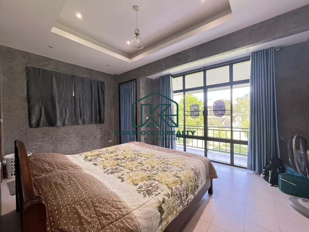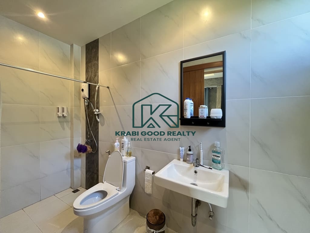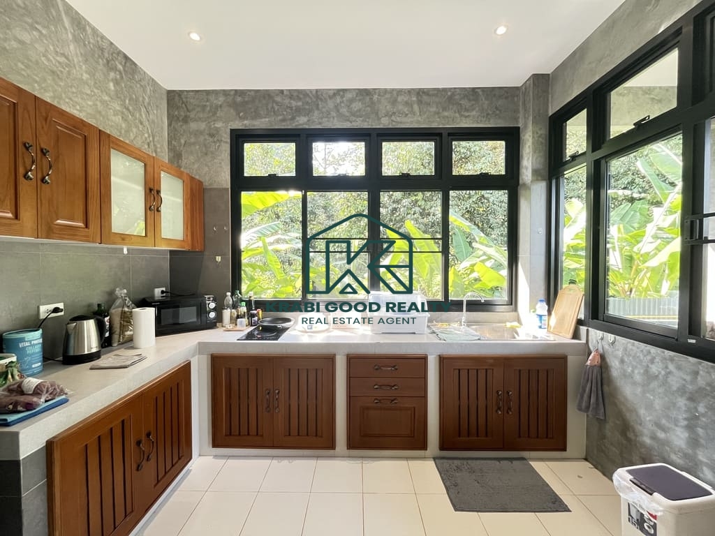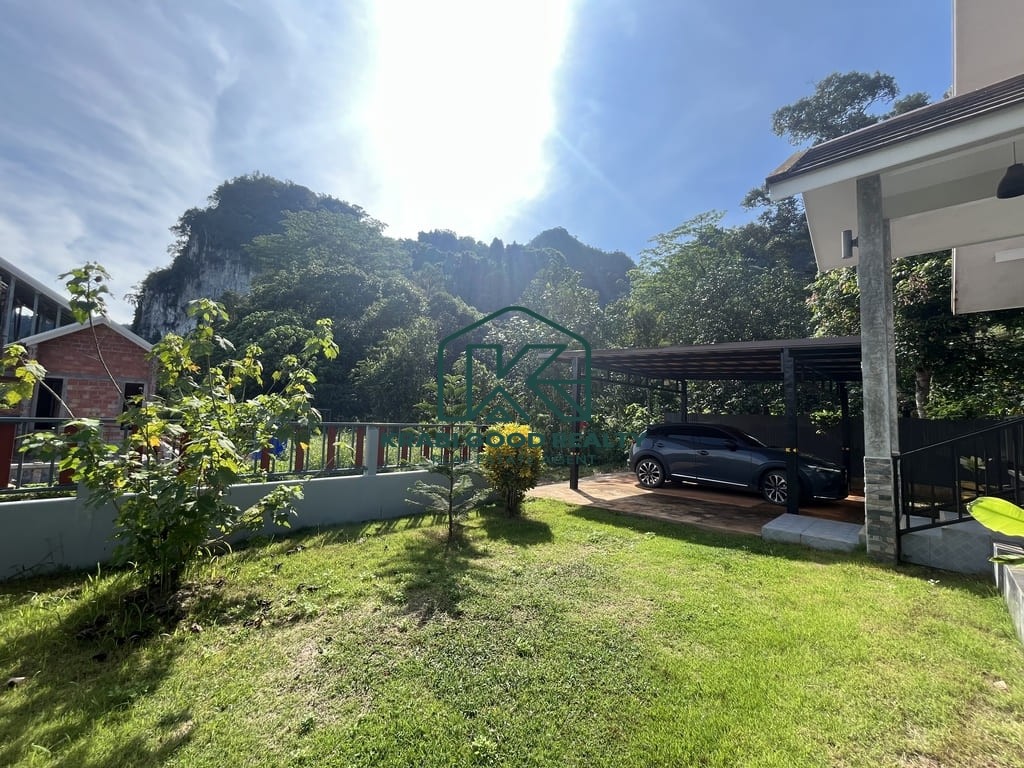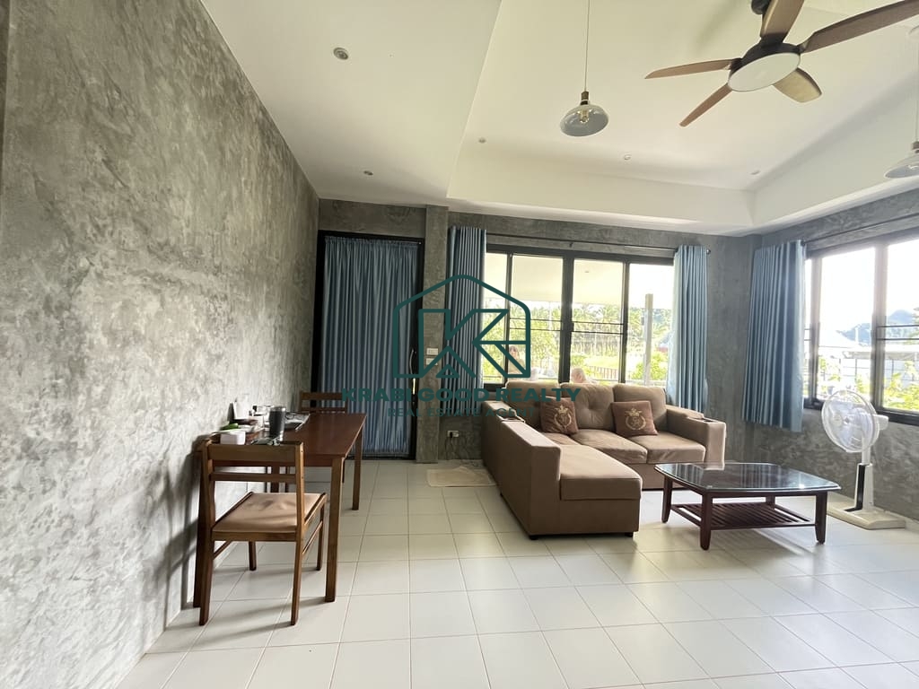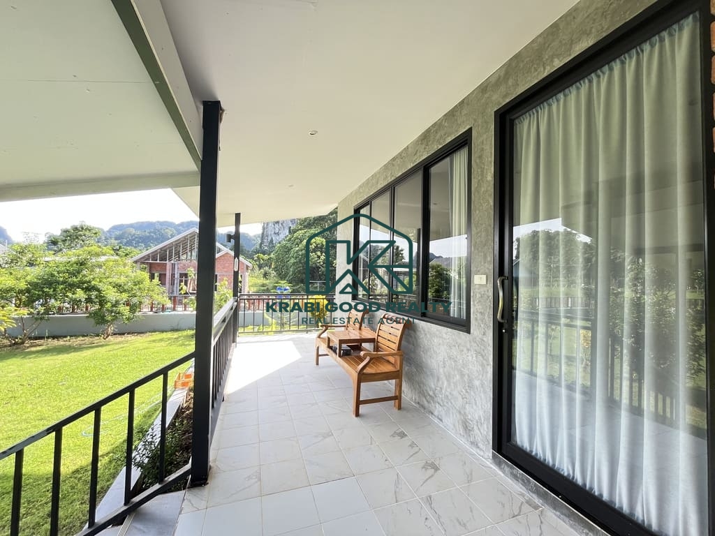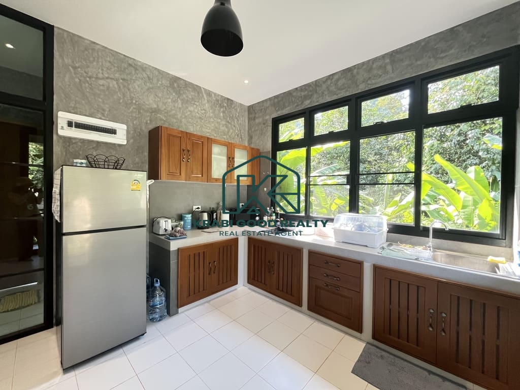 A modern 2-bedroom, 2-bathroom home for rent, complete with a fully equipped kitchen, one parking space, and full furnishings. The property sits on over 1,200 square meters of land in the peaceful Chong Phli area of Krabi, surrounded by mountain views and lush natural scenery. The spacious garden has been beautifully leveled and shaped into a clean rectangular plot. The house features a contemporary concrete-loft design, offering a stylish, minimalist, and serene living environment that blends perfectly with nature.