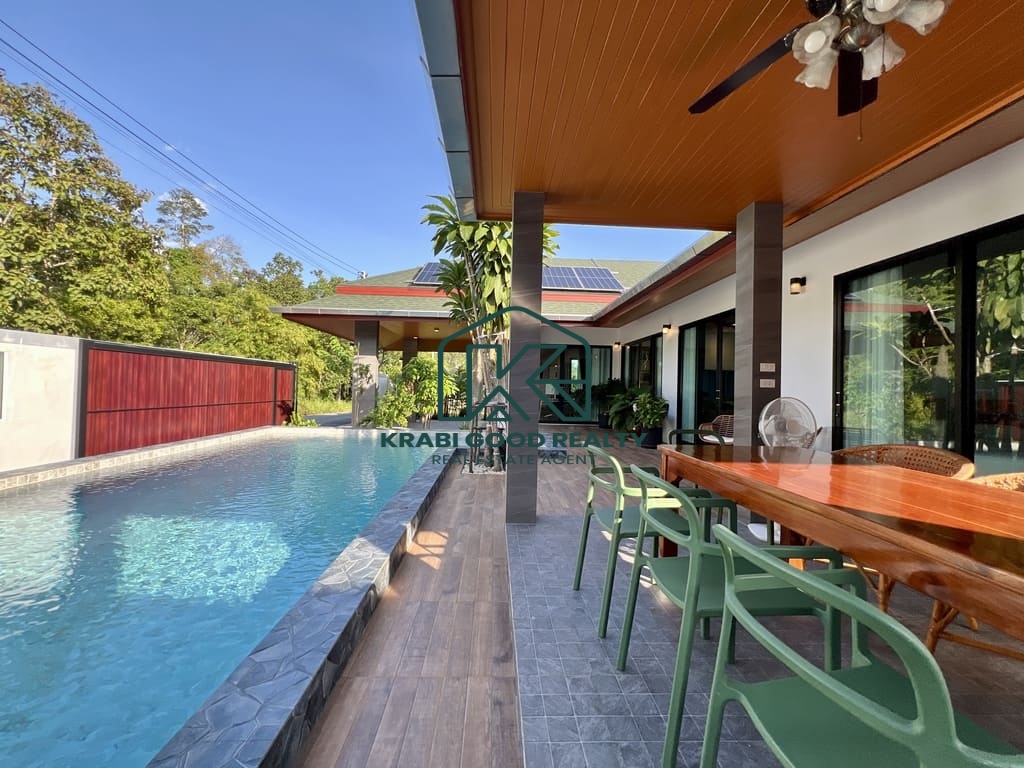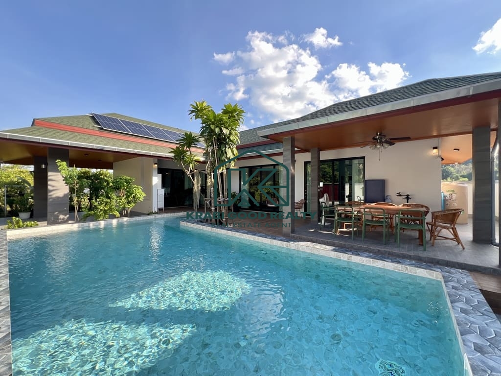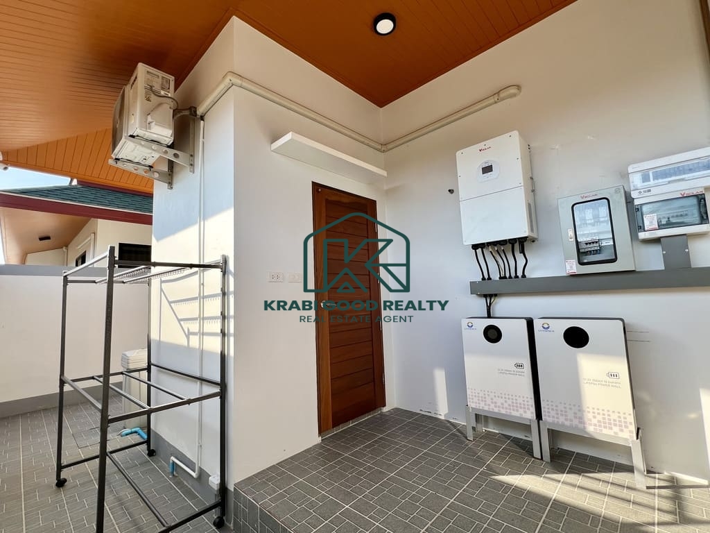 Additional features include a saltwater swimming pool, a private well with a high-quality filtration system, and solar panels installed for household use with a 16 kWh solar system and a 20 kWh battery storage system, installed in December 2025, This setup significantly enhances energy efficiency, reduces electricity costs, and provides reliable power support. Surrounded by friendly neighbors, this home offers a peaceful and sustainable living environment in Ao Nang.